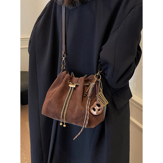 Women Vintage One Shoulder Bag Frosted Solid Drawstring Soft All-Match Bucket Bags High-Grade Versatile Commute Crossbody Packs