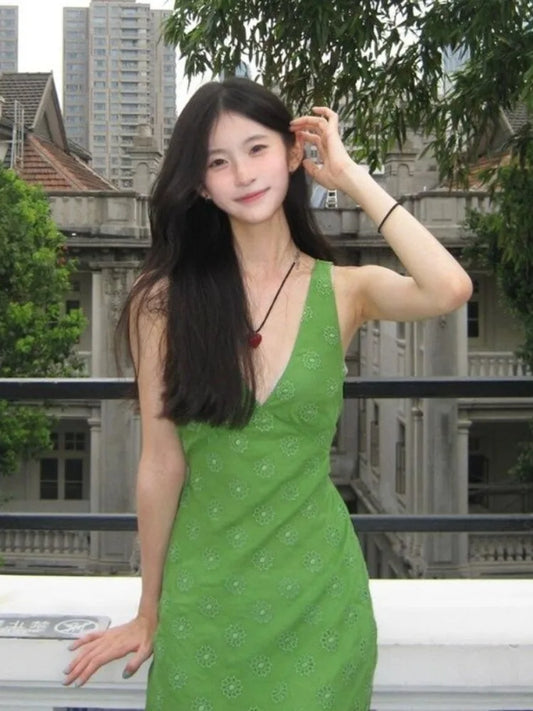 Elegant Green Print Dresses for Women V-neck Sleeveless Vintage Robe Femme 2025 Vestidos De Mujer Slim Waist Sexy Summer Dress