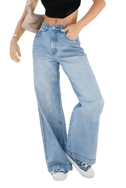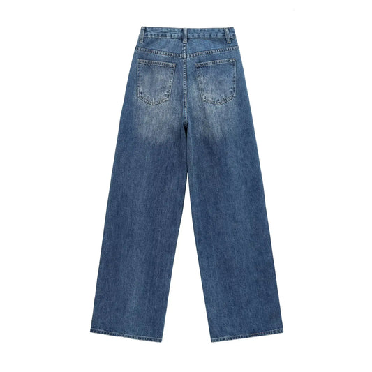 Women Fashion Vintage Washing Denim Long Pant Wide Leg High Waist Jeans 2025 New Lady Summer Commuter Y2k Denim Trousers