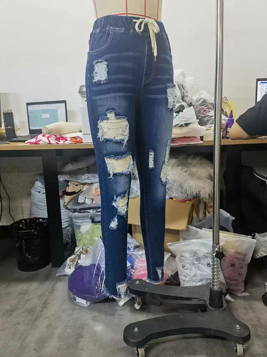 LW Women's Ripped Jeans 2024 Autumn Skinny Denim Pant Woman Fashion Drawstring Stretch Boyfriend Destroyed Pencil Jeans Female