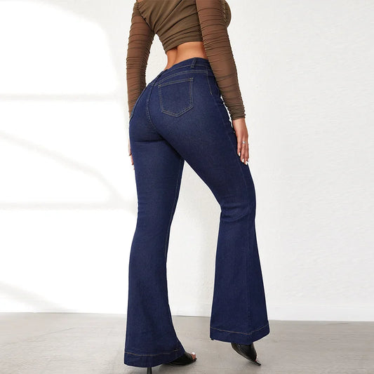 Fashion Women Commuter Slim Fit Jeans Mid Waist Micro Flared Denim Trousers Washable Floor-length Pants Female Casual Streetwear