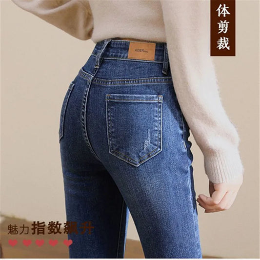 Denim Pants For Women Spring And Autumn Elastic Show Nine Points Trousers High Waist Korea Fashion Flared Jeans Female Casual