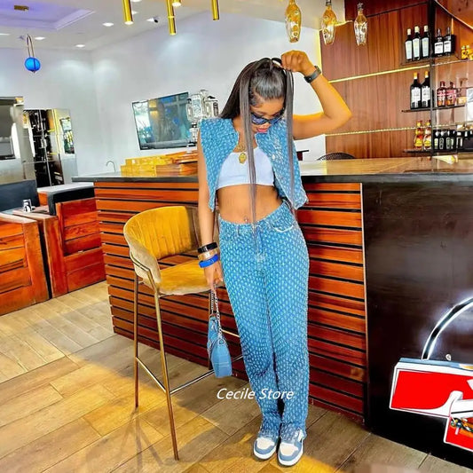New African girly jeans ripped jeans womens three-piece denim jacket women slit wide leg slit trousers jeans uomo