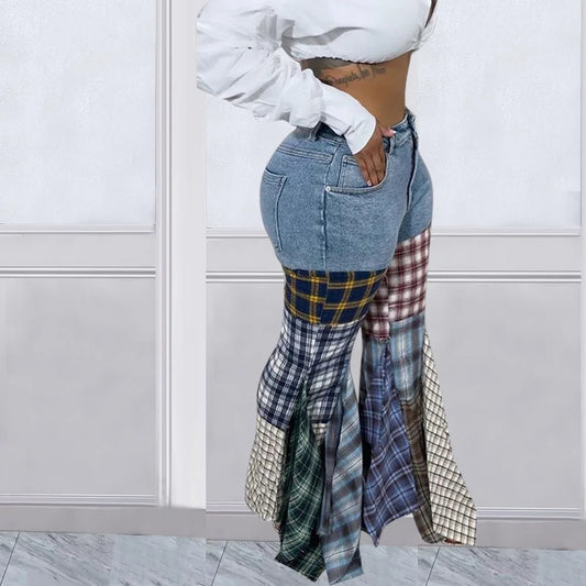 Women Jeans 2024 Summer Fashion Spliced Houndstooth Denim Ruffle Edge Flared High Waist Jeans Pants Female Trousers Streetwear