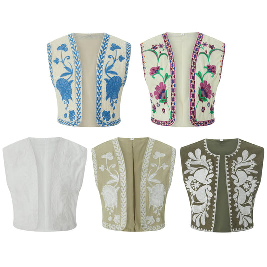 Women Vintage Embroidered Crop Vest Top Y2K Boho Floral Sleeveless Open Front Cardigan Flower Linen Vest Waistcoat Gilet Outwear