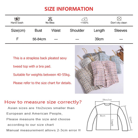 Women Summer Tweed Chain Chic Tank Tops Buttons Off Shoulder with Bra Pad Crop Tops Pleated Sexy Backless Sleeveless Sweet Camis