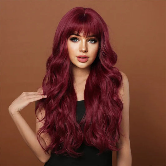 7JHHWIGS Long Body Wave Copper Highlight Beige Wig for Women High Density Synthetic Layered Modest Fashion Wigs with Neat Bangs