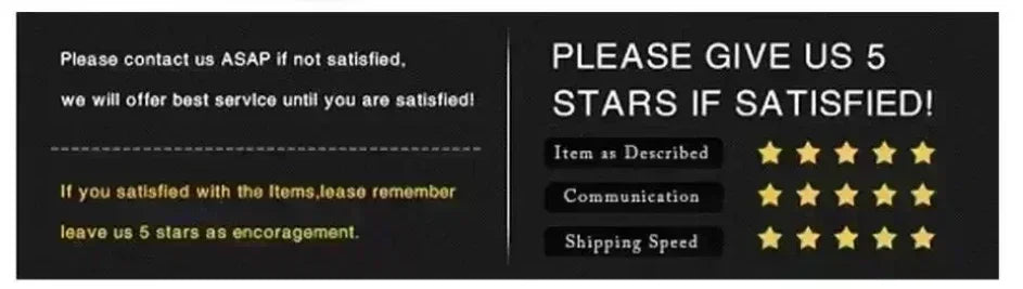 If you are satisfied with our products and services, please leave your positive feedback and5stars for the detailed rating of your order.