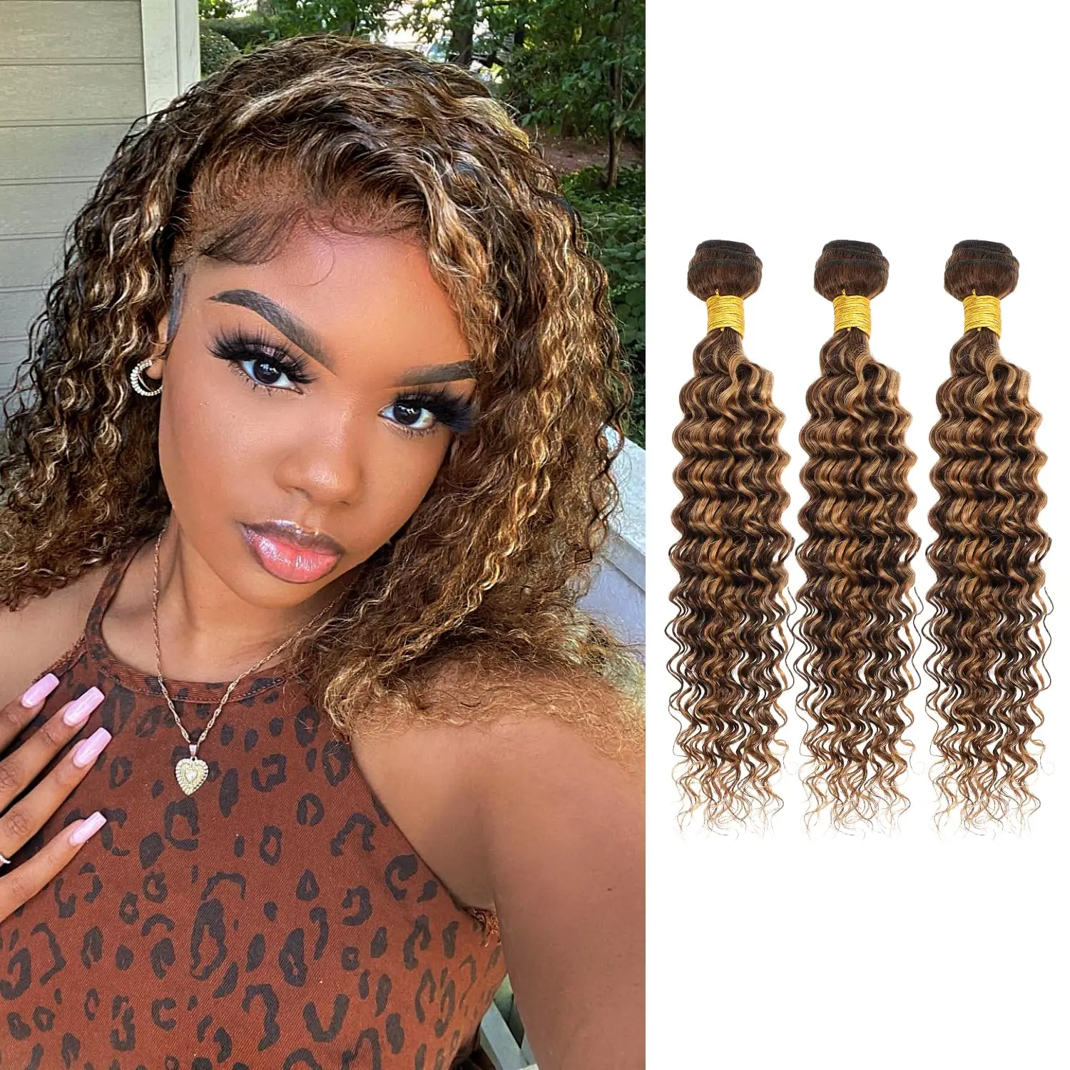 4/27 Bundles Brazilian Hair Bundles Highlight Honey Blonde Human Hair Bundle Weave Double Weft Deep Wave Virgin Hair Weaves