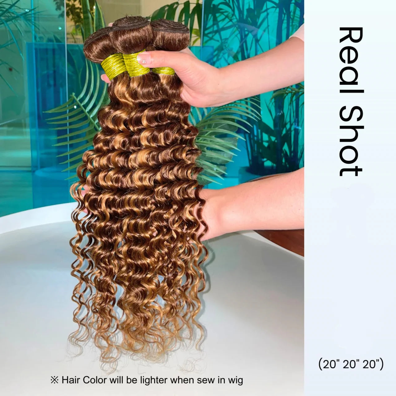 4/27 Bundles 3 Brazilian Hair Bundles Highlight Honey Blonde Human Hair Bundle Weave Double Weft Deep Wave Virgin Hair Weaves