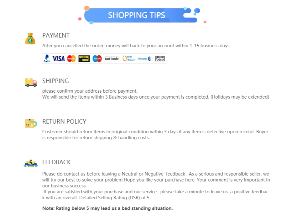 Customer service is an integral part of our business, please give us 5 star positive feedback if you are satisfied with our products and service. Thanks!