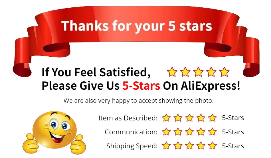2.We have always maintained high standards of excellence and strive for 100% customer satisfaction! If you receive your order in good condition, we sincerely invite you to leave Positive Feedback 5-Star Detailed Seller Ratings for us and it will be greatly appreciated!