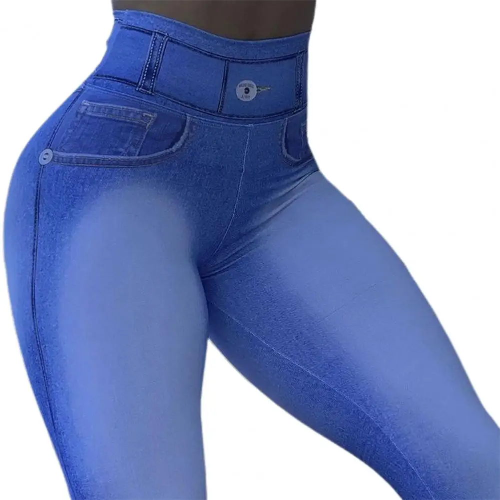 High Waist Pockets Tummy Control Butt Lifting Fitness Leggings Gradient Color Push Up Imitation Jeans Skinny Women Yoga Pants Activewear