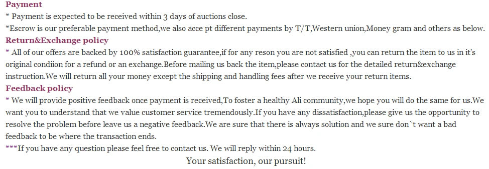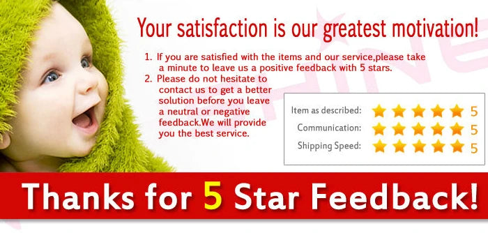 Since your feedback is very important to our business development, we sincerely invite you to leave positive feedback for us if you are satisfied with our product and service. It will just take you 1 minute. Thank you! :) If you arenot satisfied with product and service,please kindly contact us before leaving any negotive and and neutralfeedback. We will try our best to satisfy you. Thank you! :)