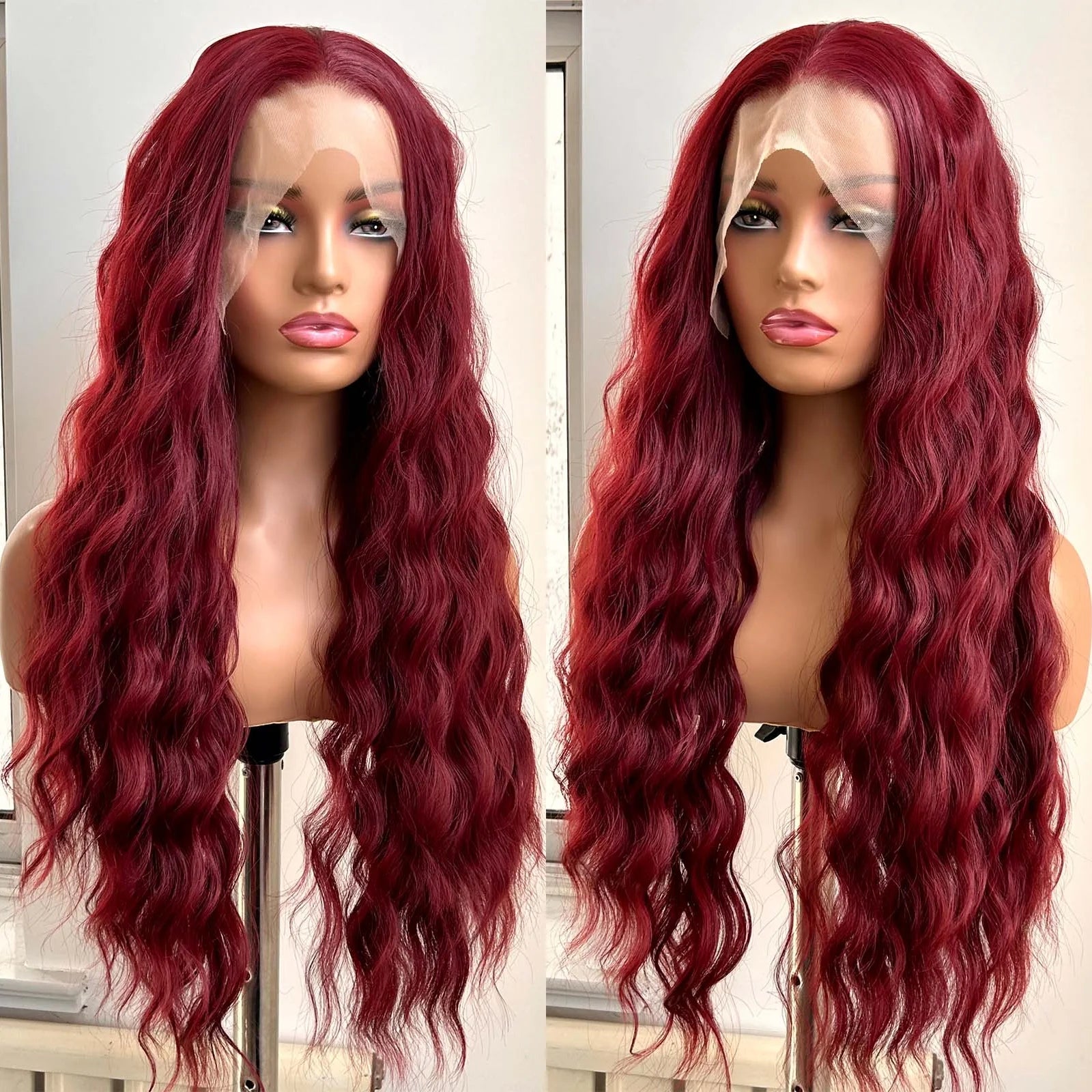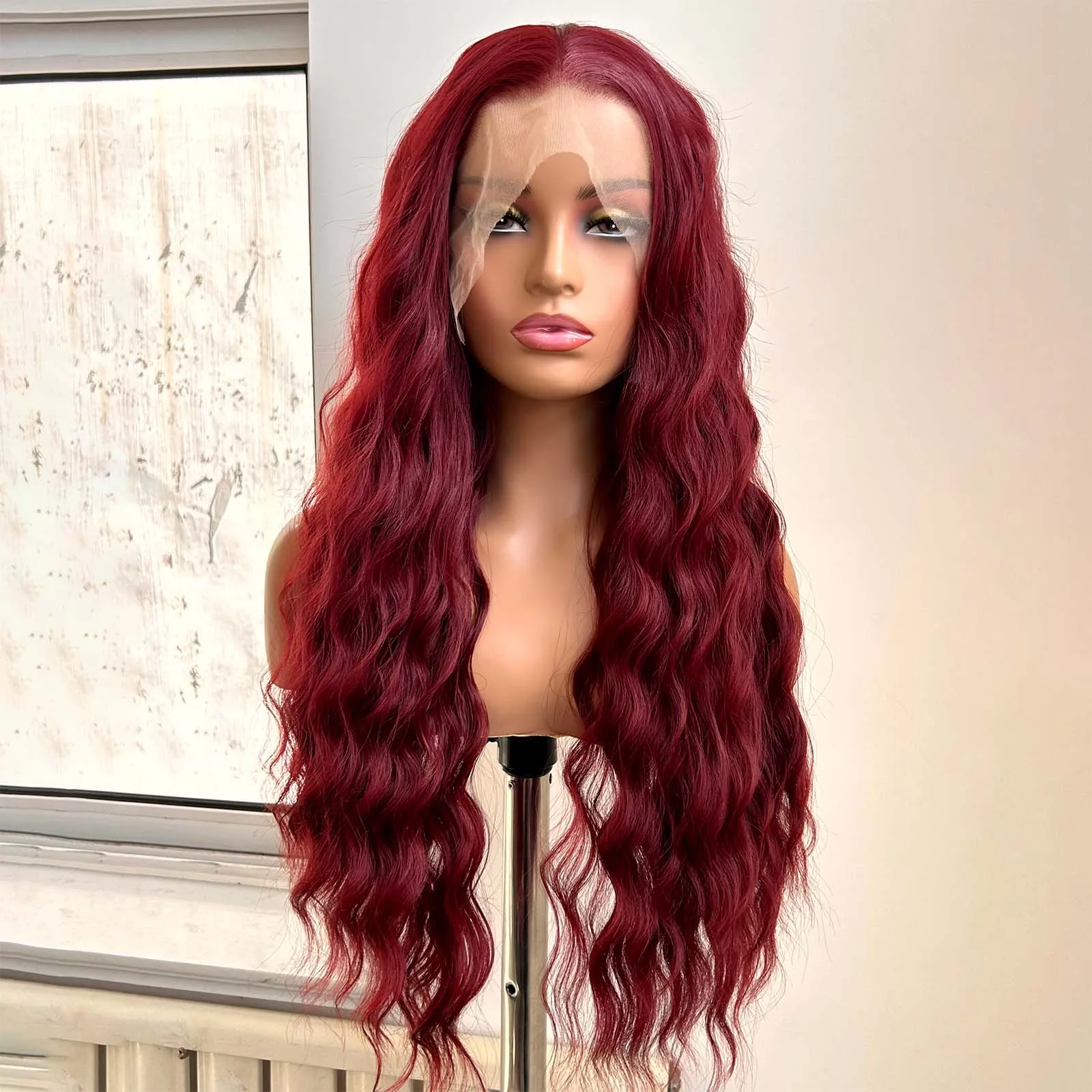 Burgundy Long Curly Wavy Red Wig Synthetic Middle Part Loose Deep Natural Wave 13X4 Wine Red Wigs for Women Daily Party Cosplay