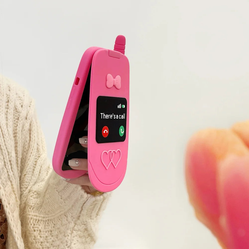 Cute 3D Hot Pink Bow Cellphone Model Flip Mirror Silicone Cases For iPhone 15 14 13 12 Pro Max 11 Shockproof Soft Cover Gifts