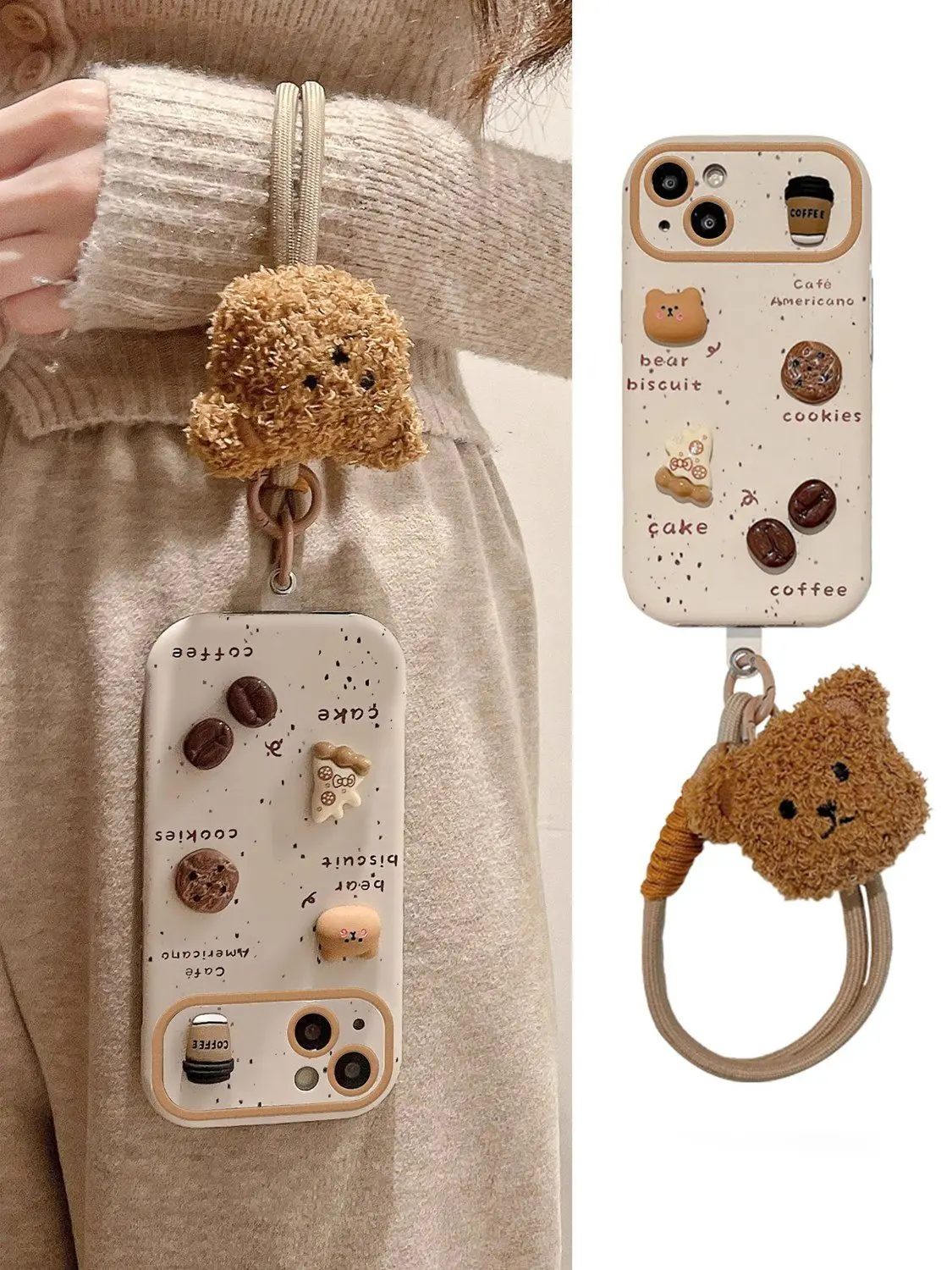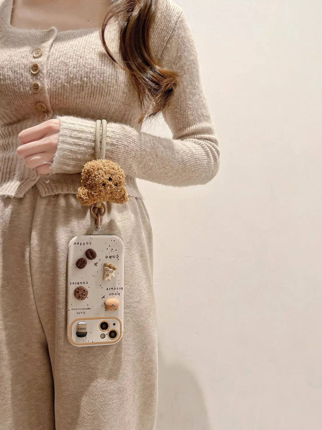 Cute Bear Coffee Phone Case, for IPhone 11 15 14 13 12 Pro Max 15Pro 14Pro Shockproof Silicone Cover ,with Lanyard Full Cases