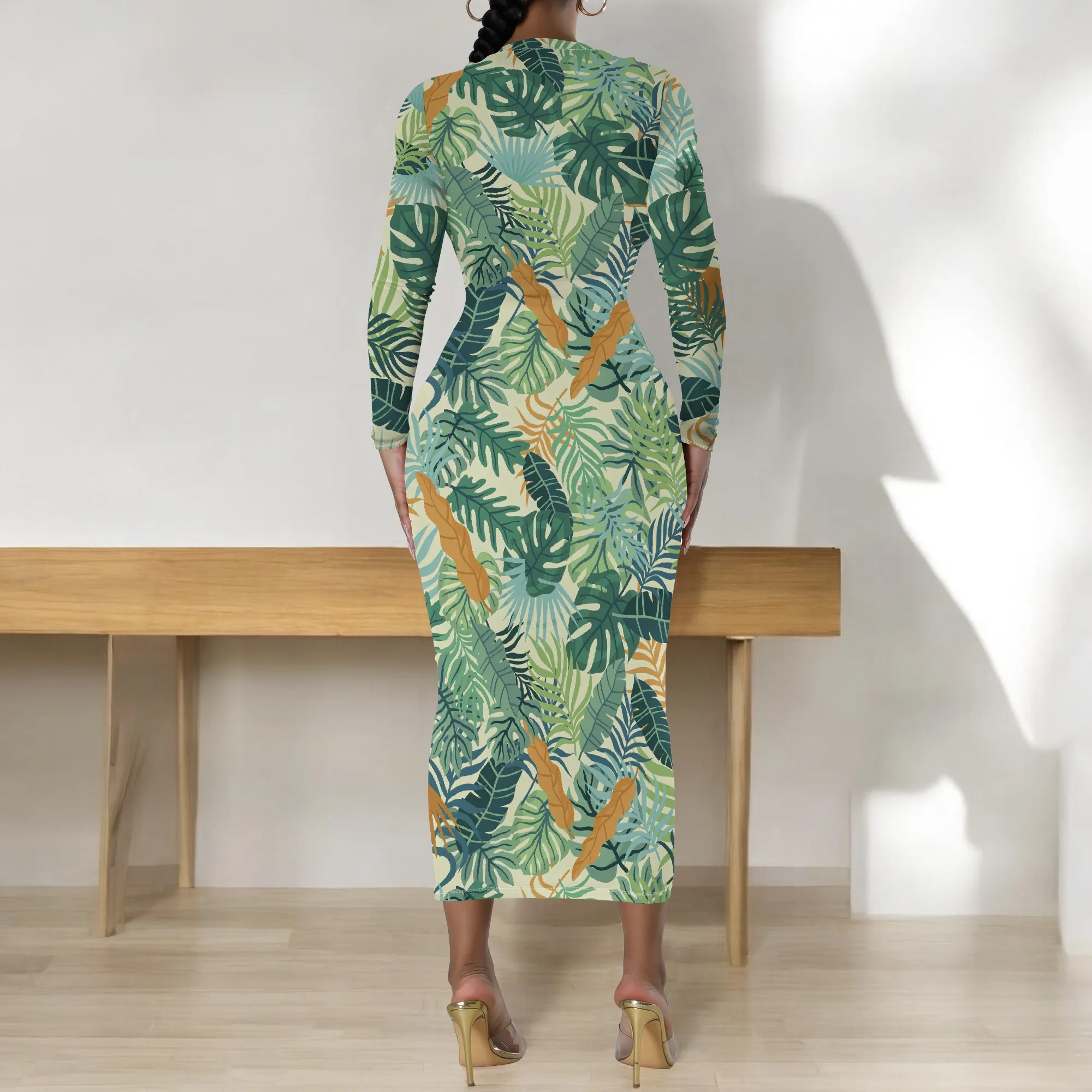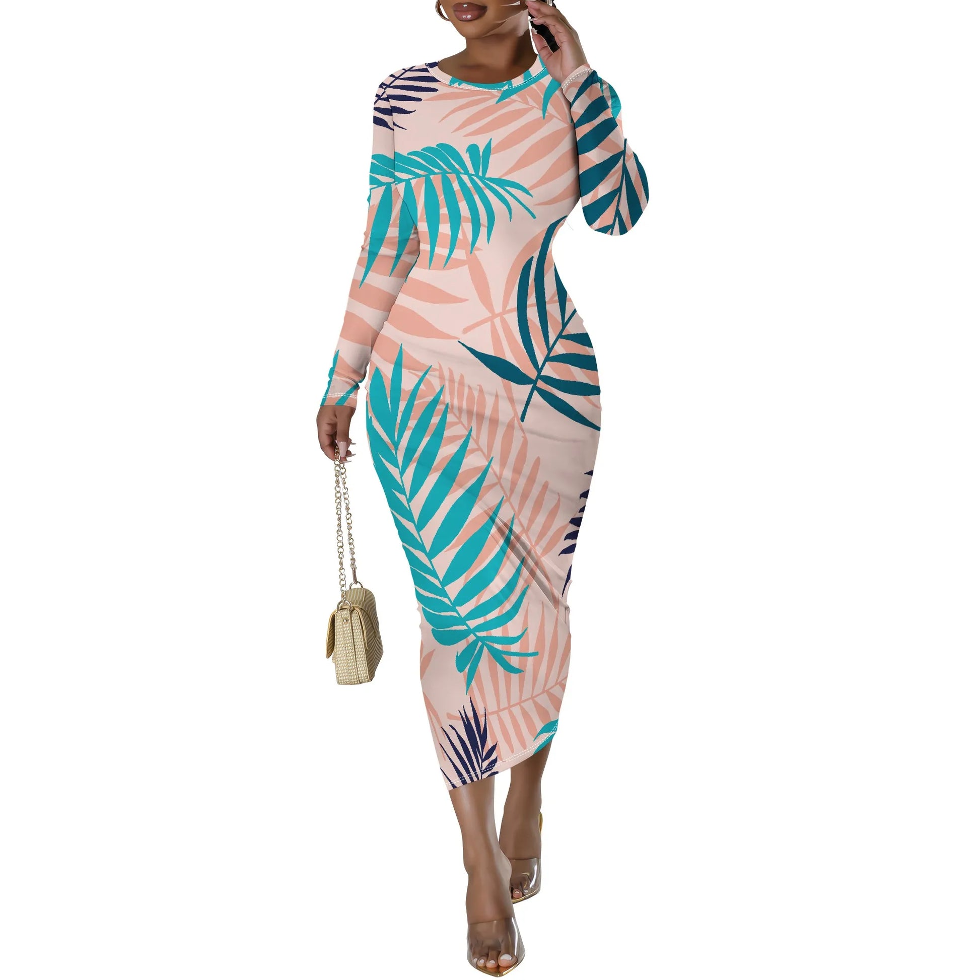 Date Night Dresses for Women Floral Print Crewneck Long Sleeve Stretchy Fitted Bodycon Maxi Dress