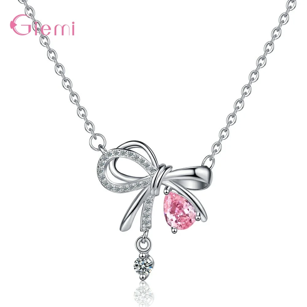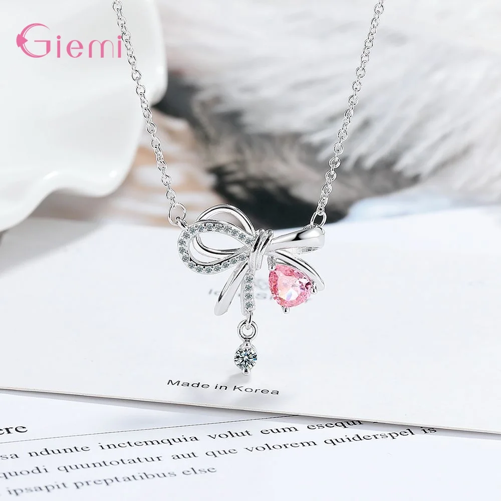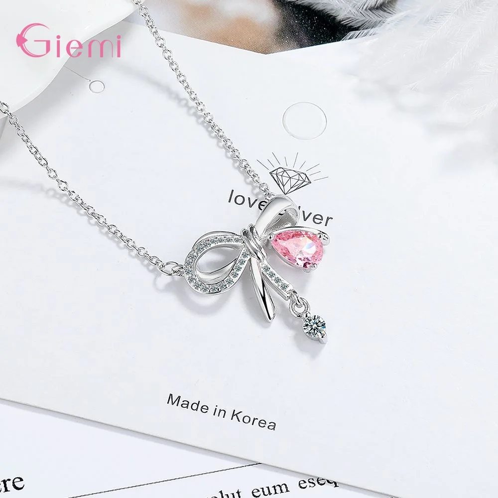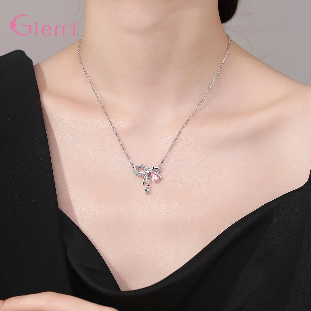 Delicate 925 Sterling Silver Necklaces for Women Sweet Bowknot Pink Zircon Pendant Necklace Holiday Party Fashion Jewelry Gifts