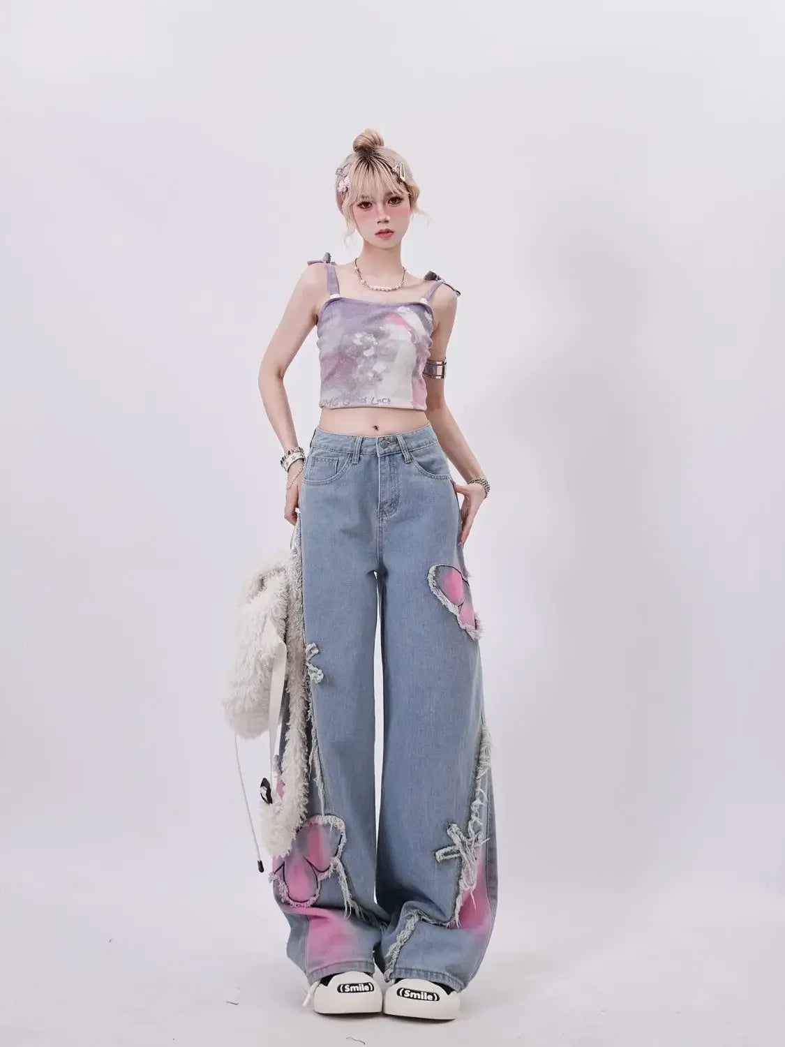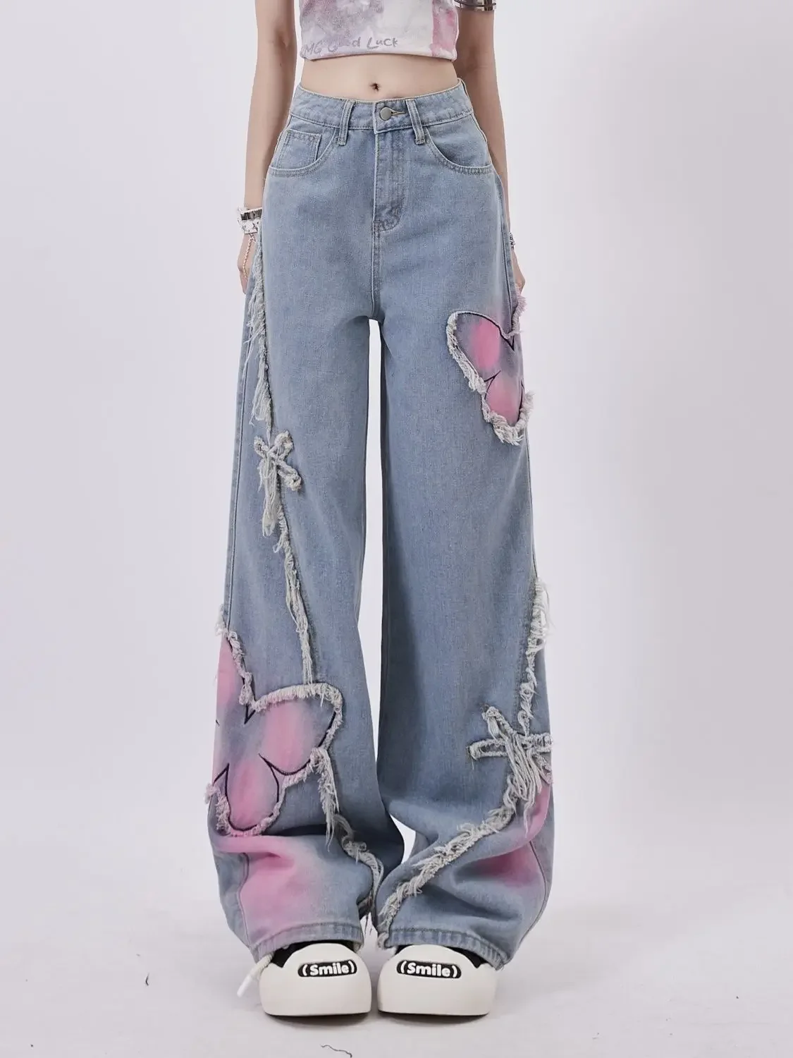 Denim Pants for Women Butterfly Gyaru Womens Jeans Embroidered 90s Loosefit 2025 Fashion Trousers Pant Cool Stretched Wide Leg Z