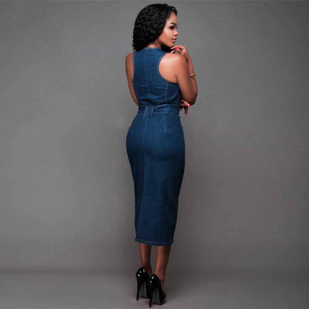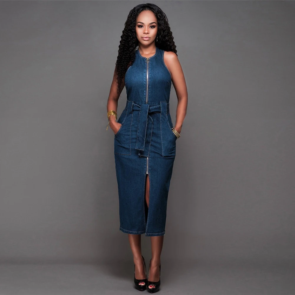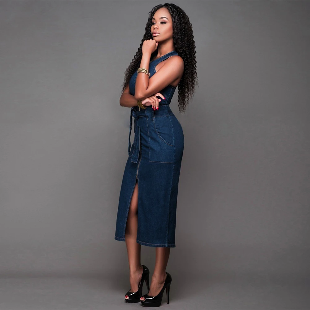 Dresses for Women 2023 Sexy Sleeveless Front Pocket Belt Zipper Slit Slim Fit Bodycon Denim Dress vestido de mujer femme robe