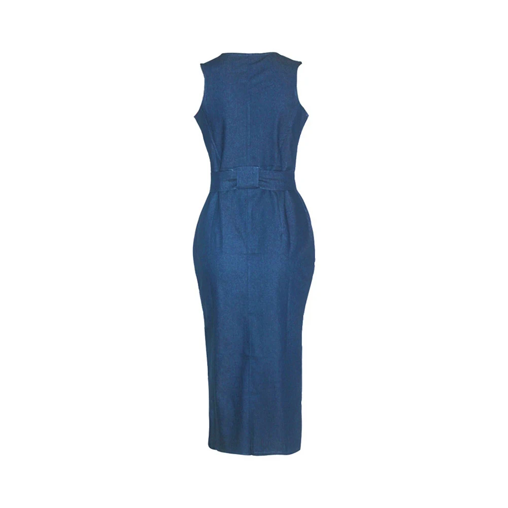Women Sexy Sleeveless Front Pocket Belt Zipper Slit Slim Fit Bodycon Denim Dress