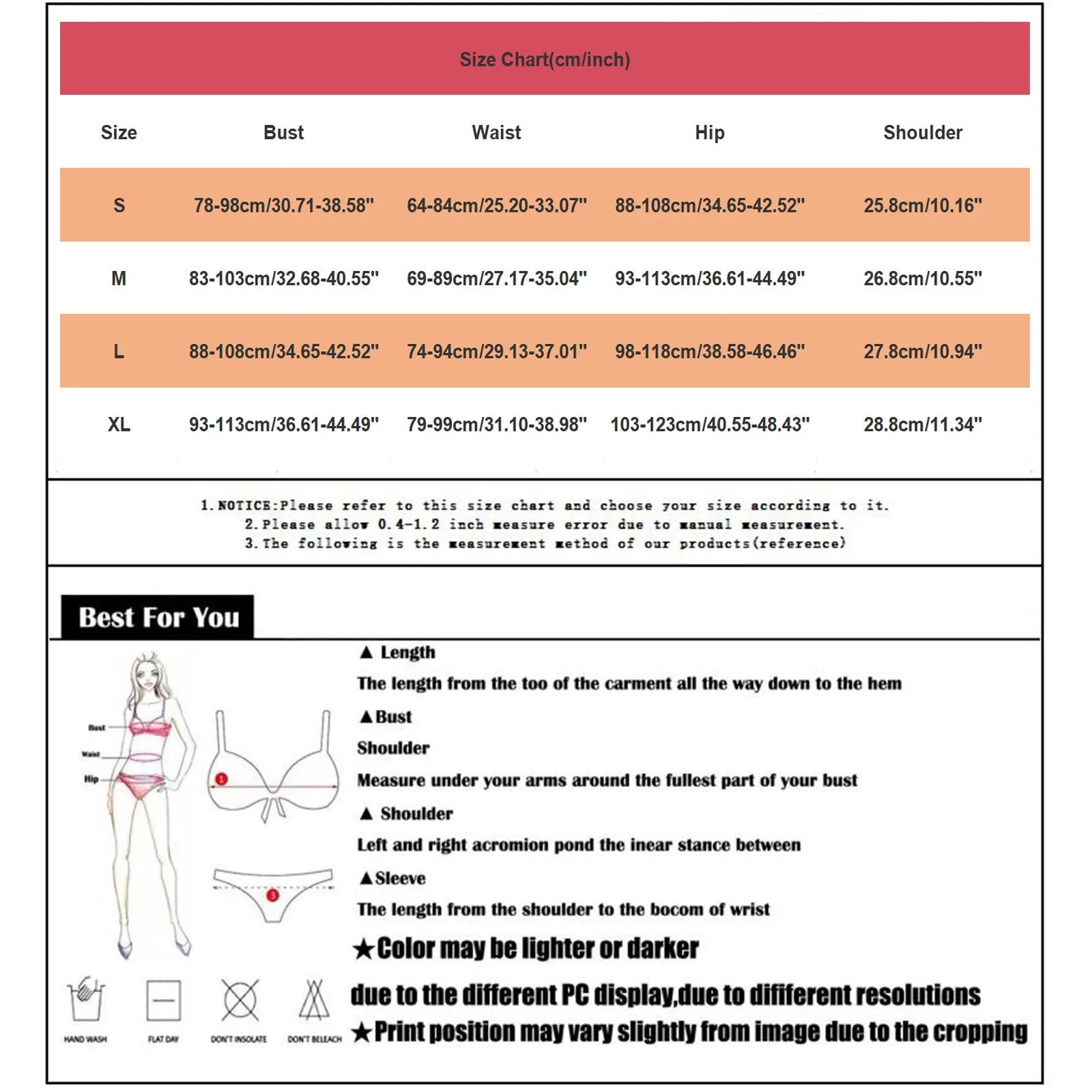 | Size:L | Bust:88-108cm/34.65-42.52'' | Waist:74-94cm/29.13-37.01'' | Hip:98-118cm/38.58-46.46'' | Shoulder:27.8cm/10.94'' |