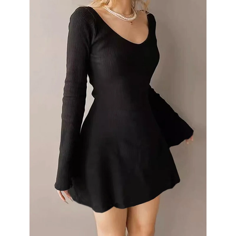Elegant And Pretty Women Dresses Autumn Winter New Black Sexy Short Dress Female V Neck Long Sleeve Slim Solid Color Mini Dress
