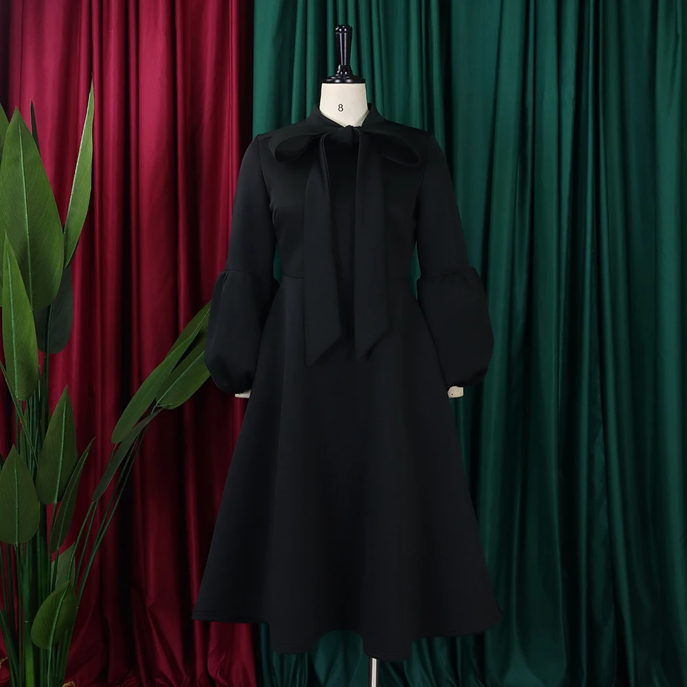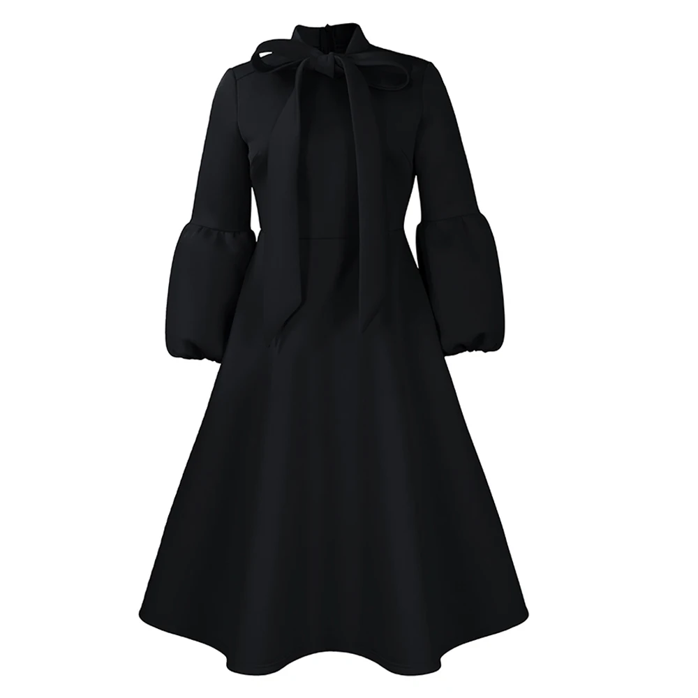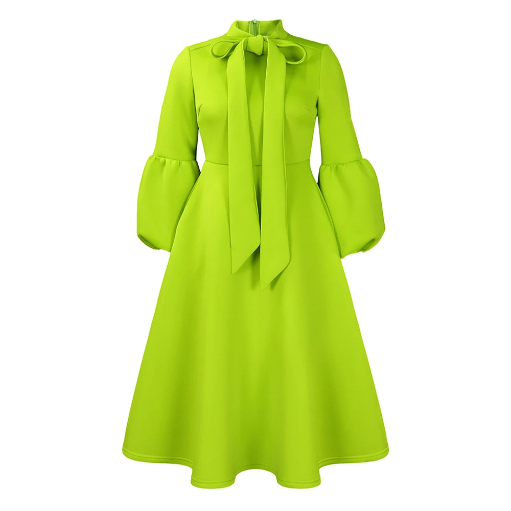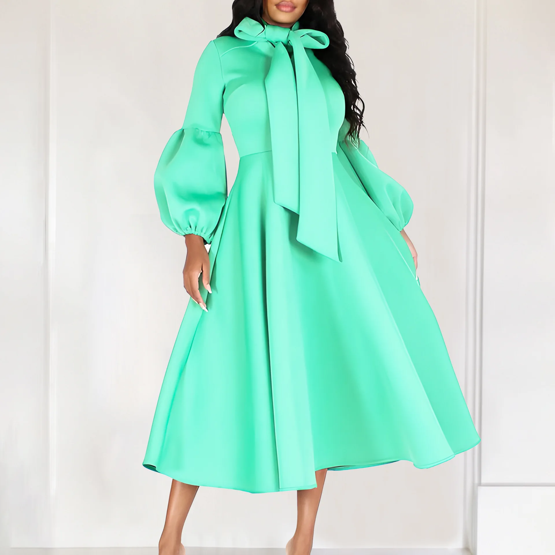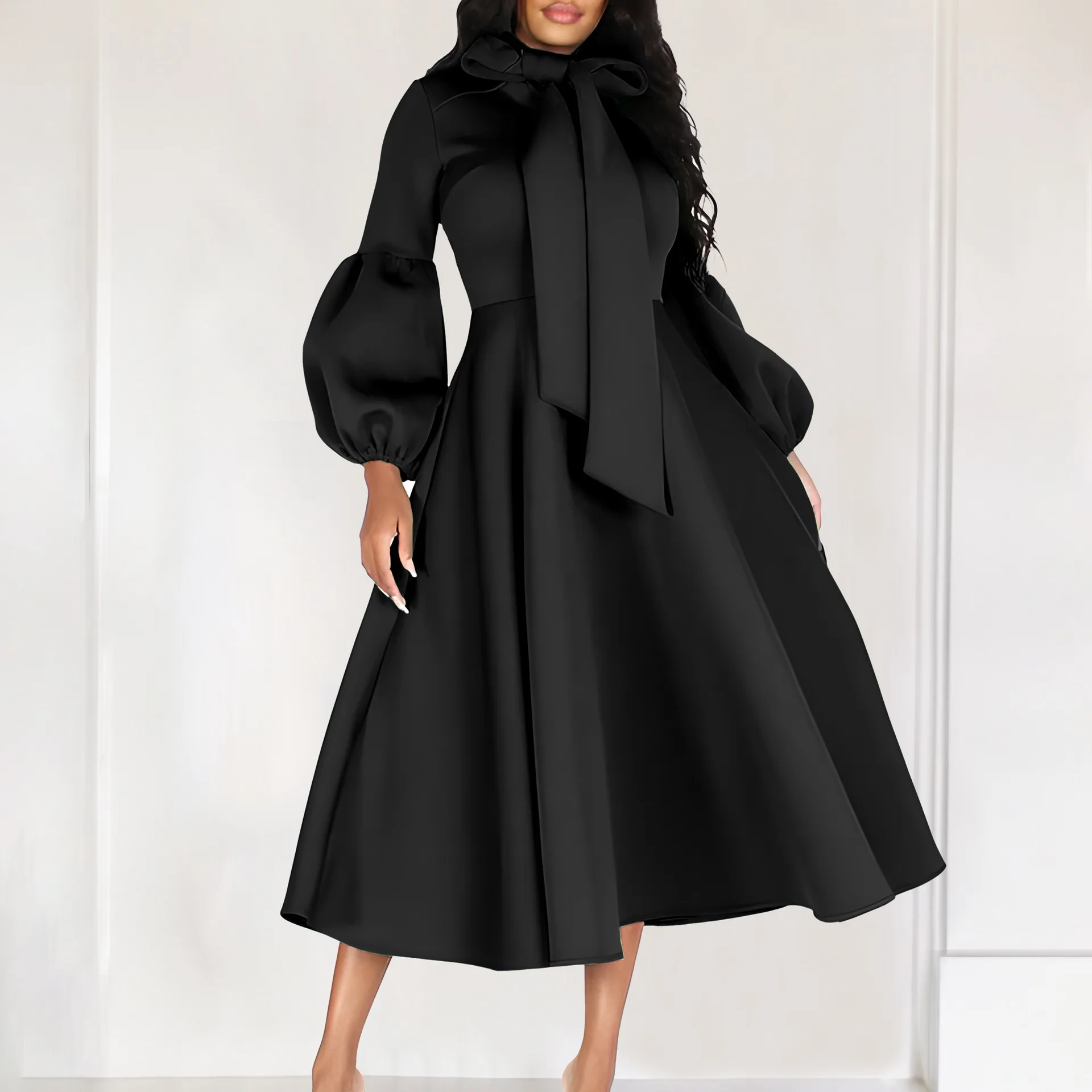 Elegant Dresses for Women Bow Collar Full Sleeve High Waisted A Line Mid Calf Luxury Female Birthday Party Dinner Vestidos Mujer