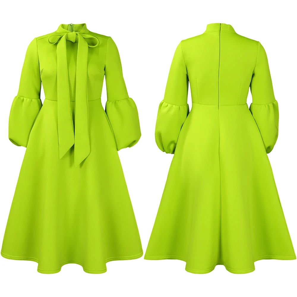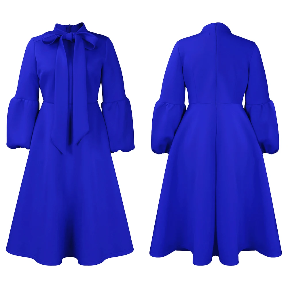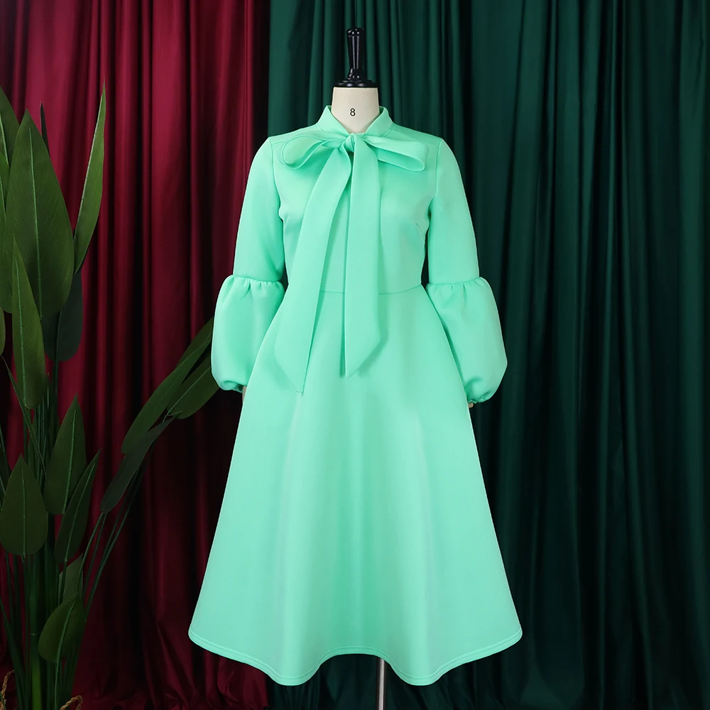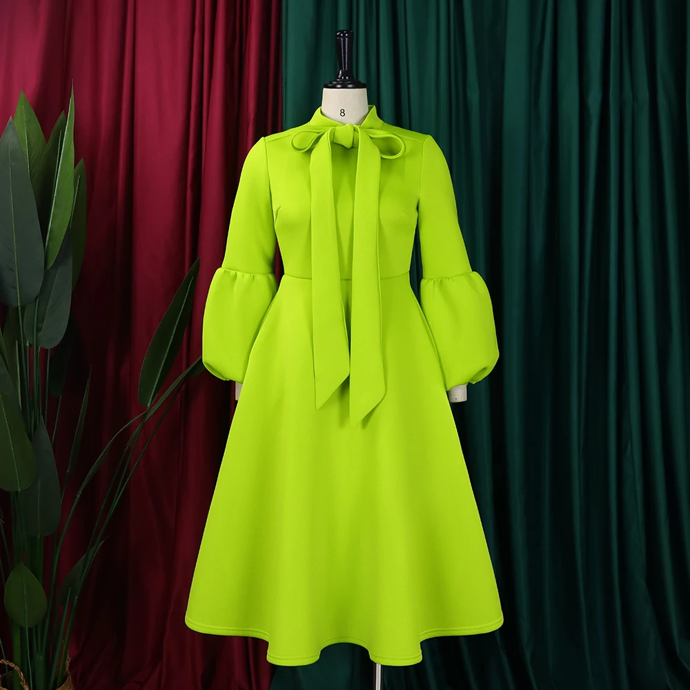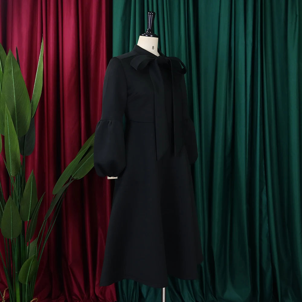 Elegant Dresses for Women Bow Collar Full Sleeve High Waisted A Line Mid Calf Luxury Female Birthday Party Dinner Vestidos Mujer