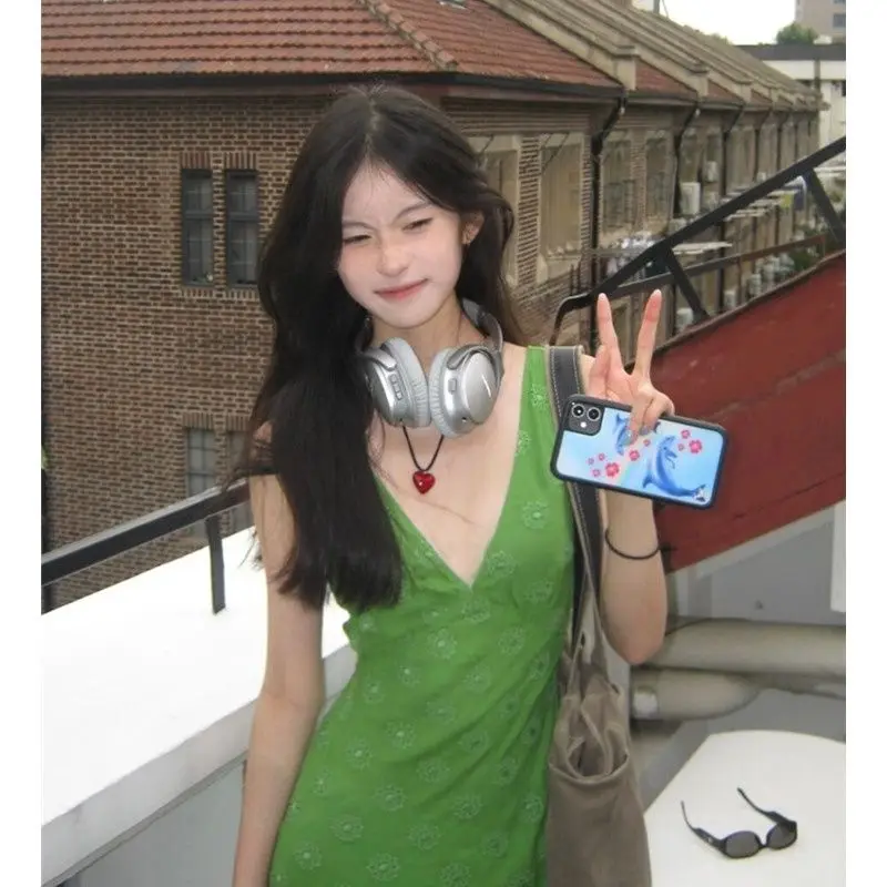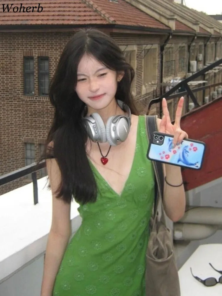 Elegant Green Print Dresses for Women V-neck Sleeveless Vintage Robe Femme 2025 Vestidos De Mujer Slim Waist Sexy Summer Dress