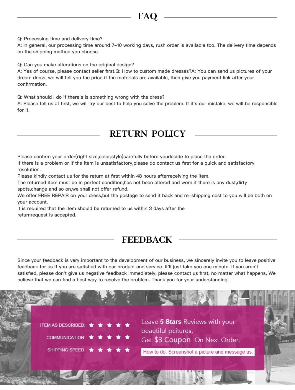 F. All dresses are not in stock, production begins after theorder is confrmed.