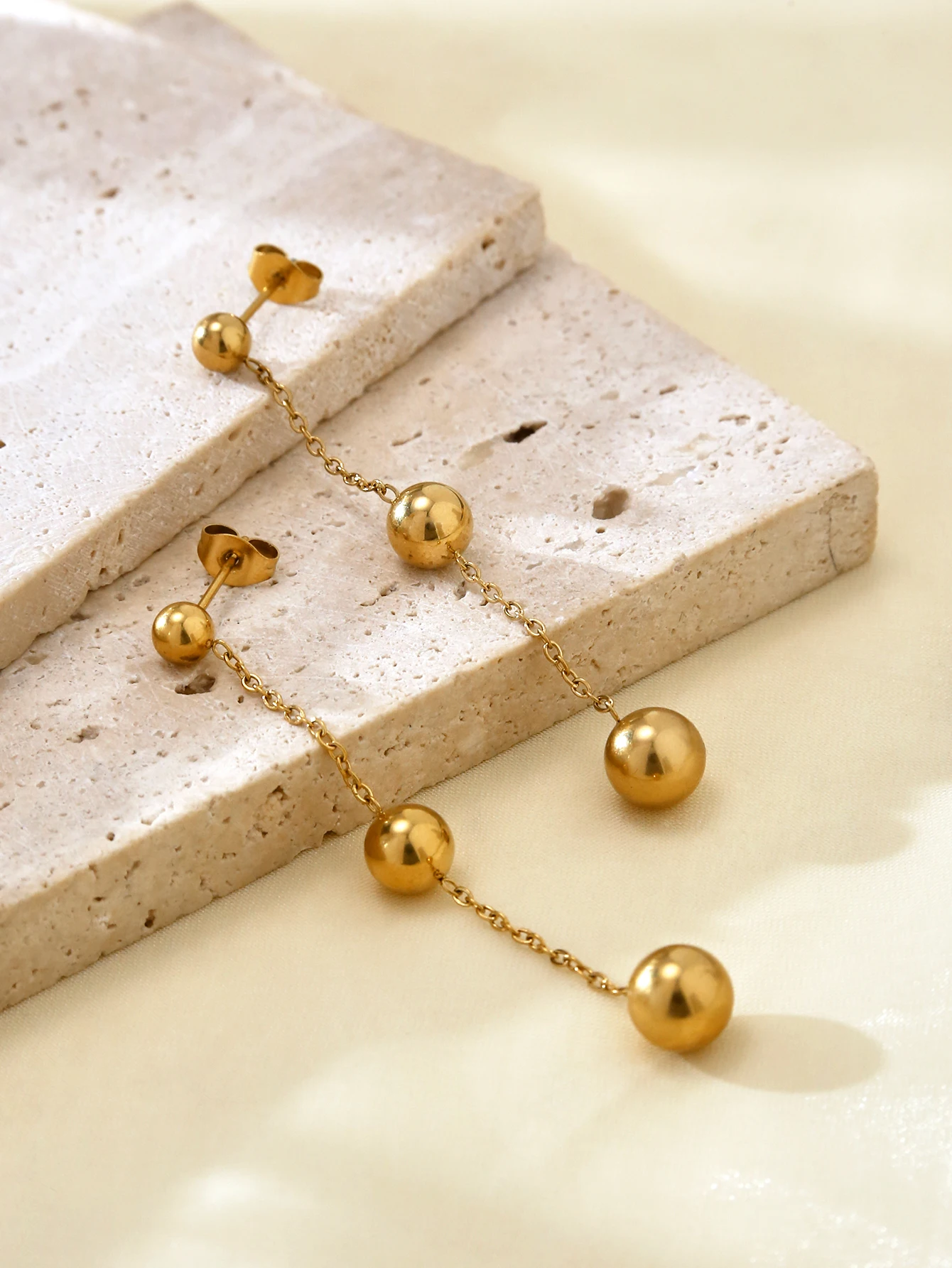 Fashion Elegant Simple Premium Feeling Stainless Steel 18K Gold Plated Three Large And Small Beads Dangle Earrings For Women