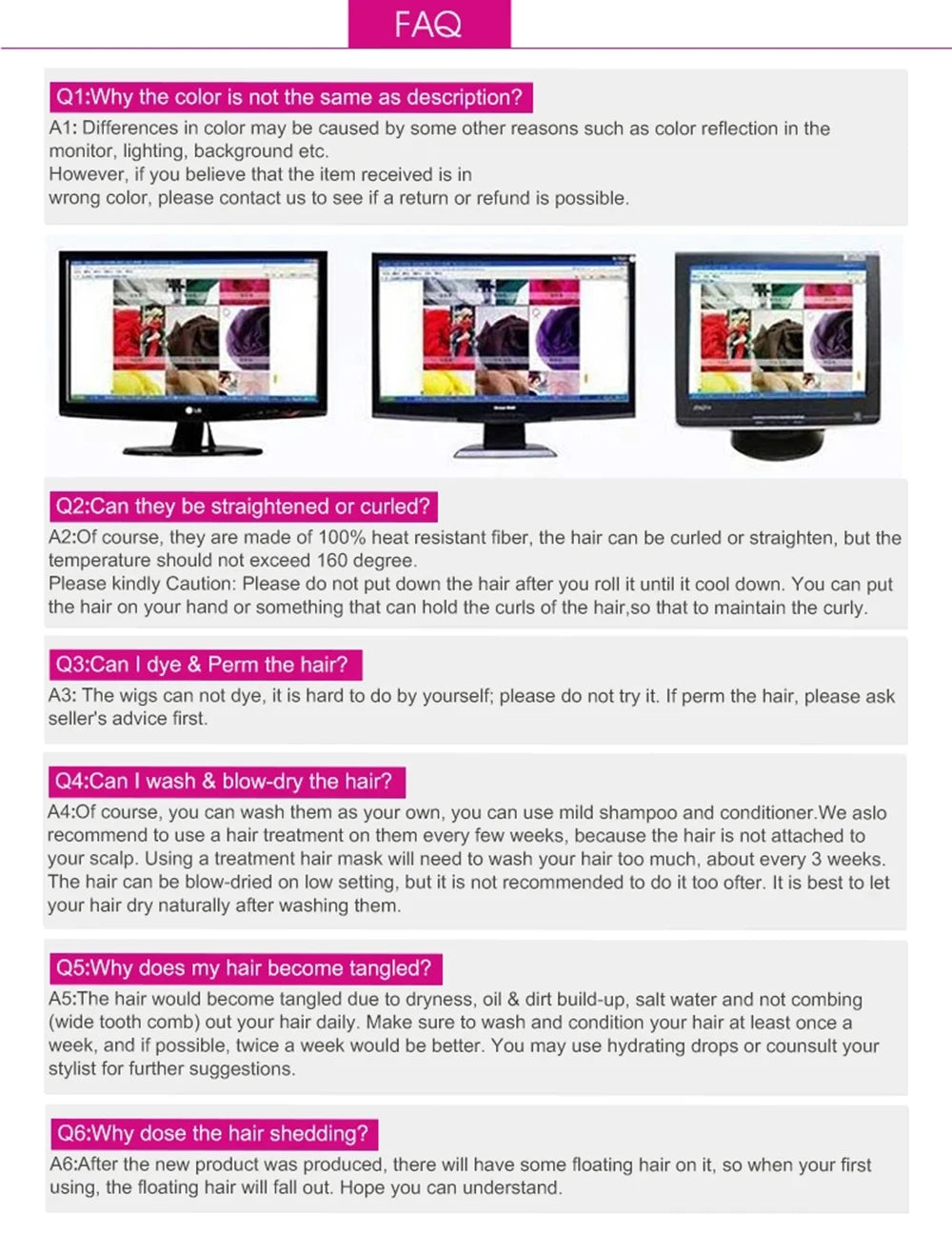 ❺You can trim the length of the wig according to your preferences and use straight clips and curling irons to create new styles, but you need to control the temperature below 160 ℃ (320 ℉).