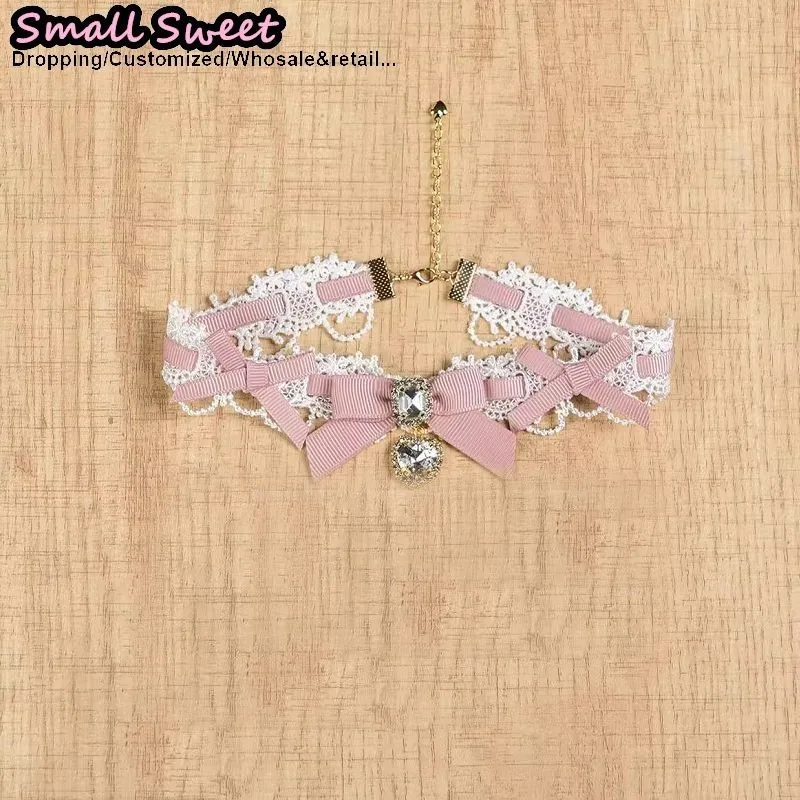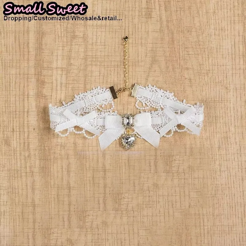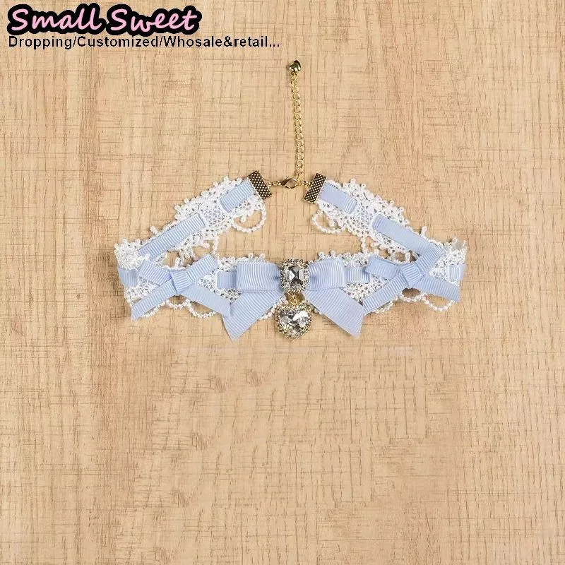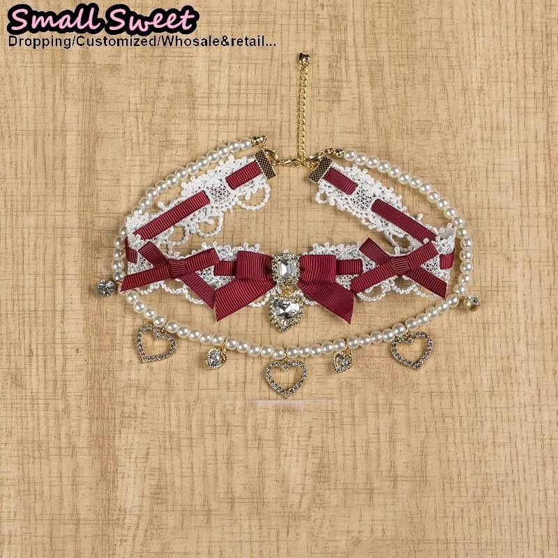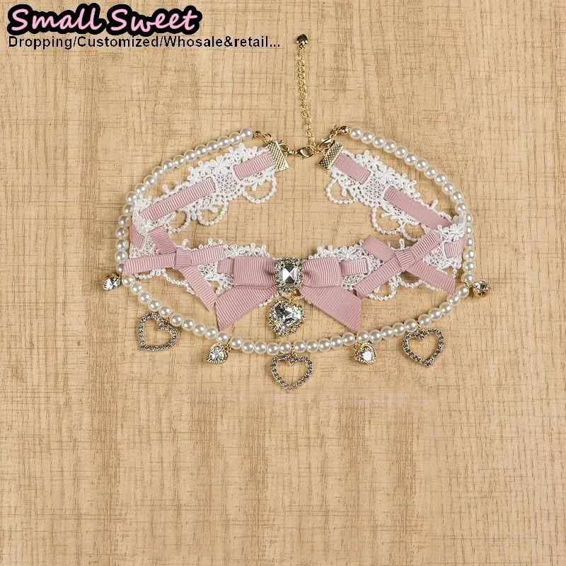 Handmade Choker Necklaces Double Pearl bow love jewelry gemstone sweet Cute Kawaii Collar Lolita Collarbone Chain Cecklace Women