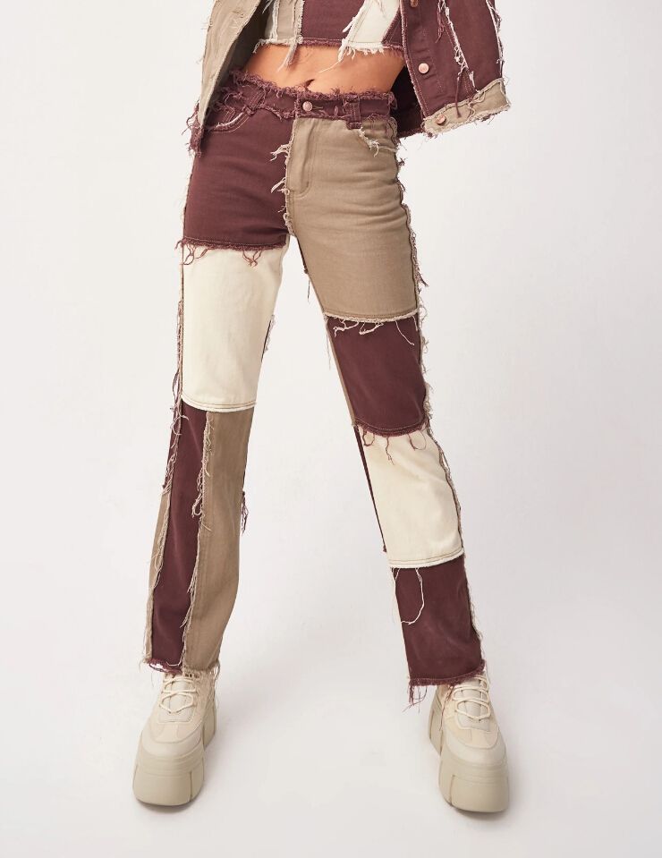 Heathered Panel High-Rise Straight-Leg Jeans Mixed Color Patchwork Denim Female