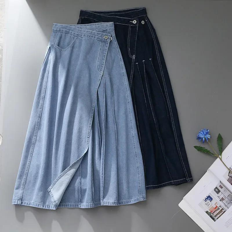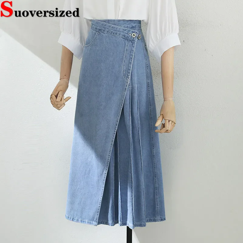 Irregular Pleated Baggy Denim Skirt Women Casual High Waist Vintage Faldas Korean Fashion Streetwear Loose A-lined Jean Skirts