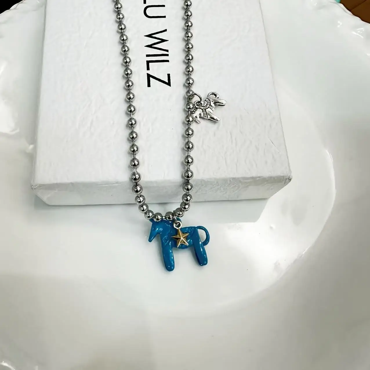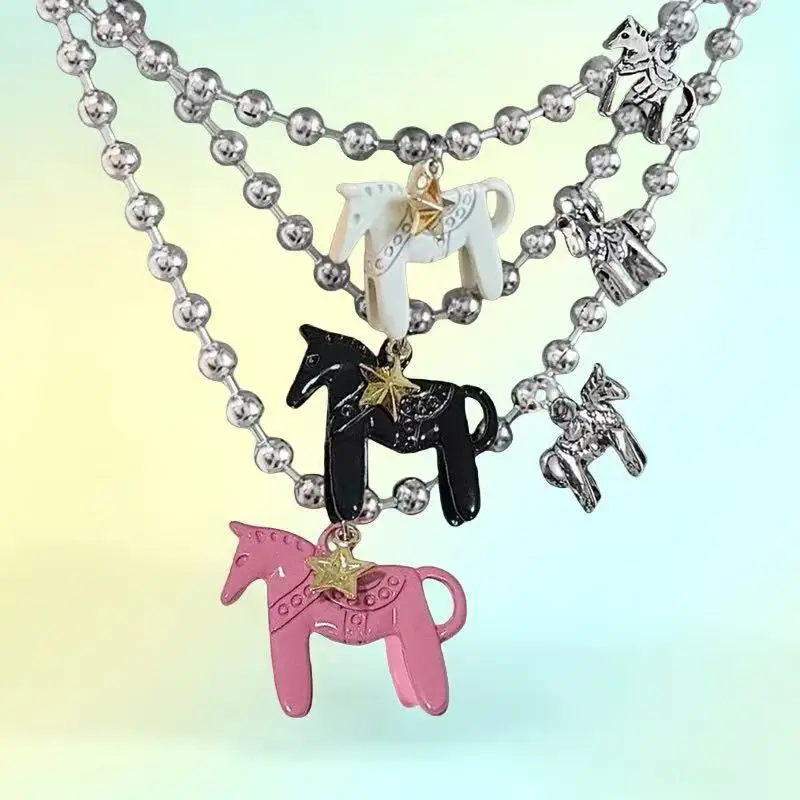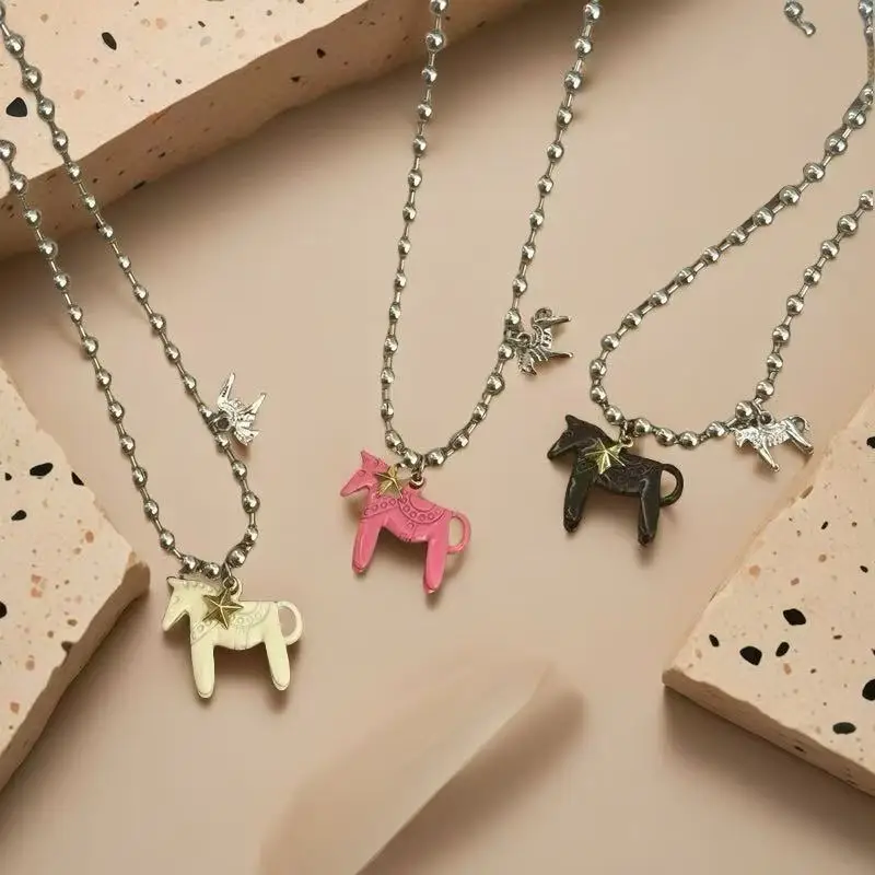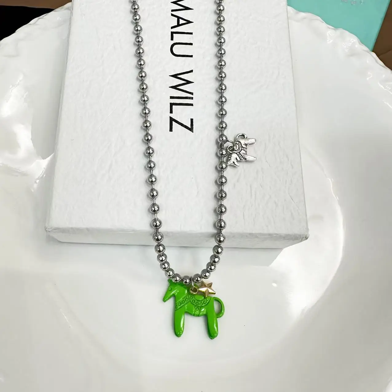 LATS White Black Green Blue Pink Color Enamel Colt Horse Pendant Necklaces for Women Silver Plated Alloy Beads Chain Chokers