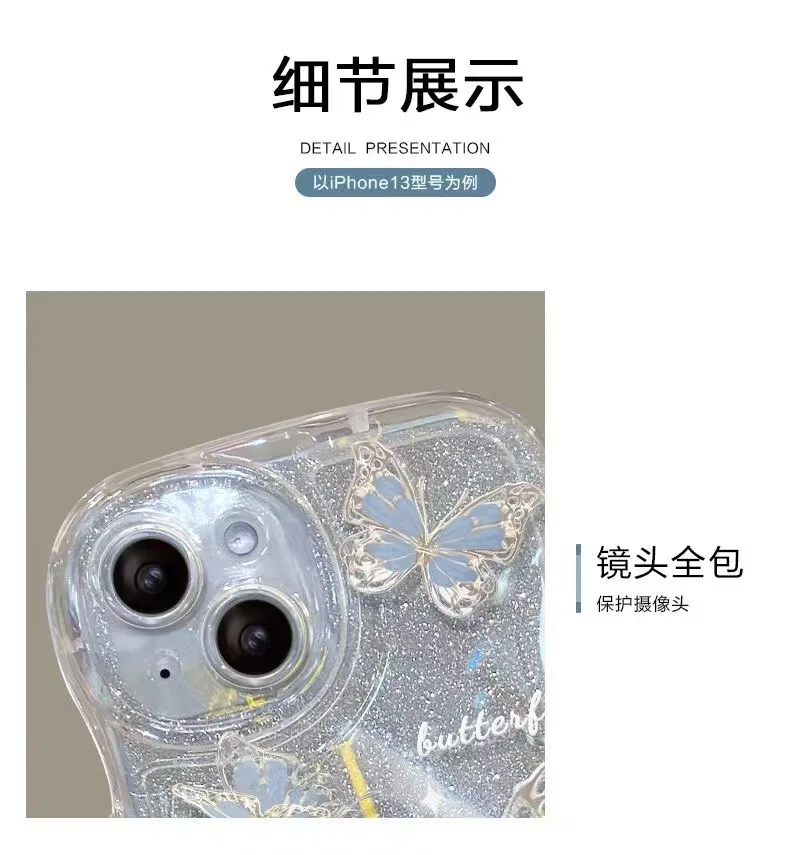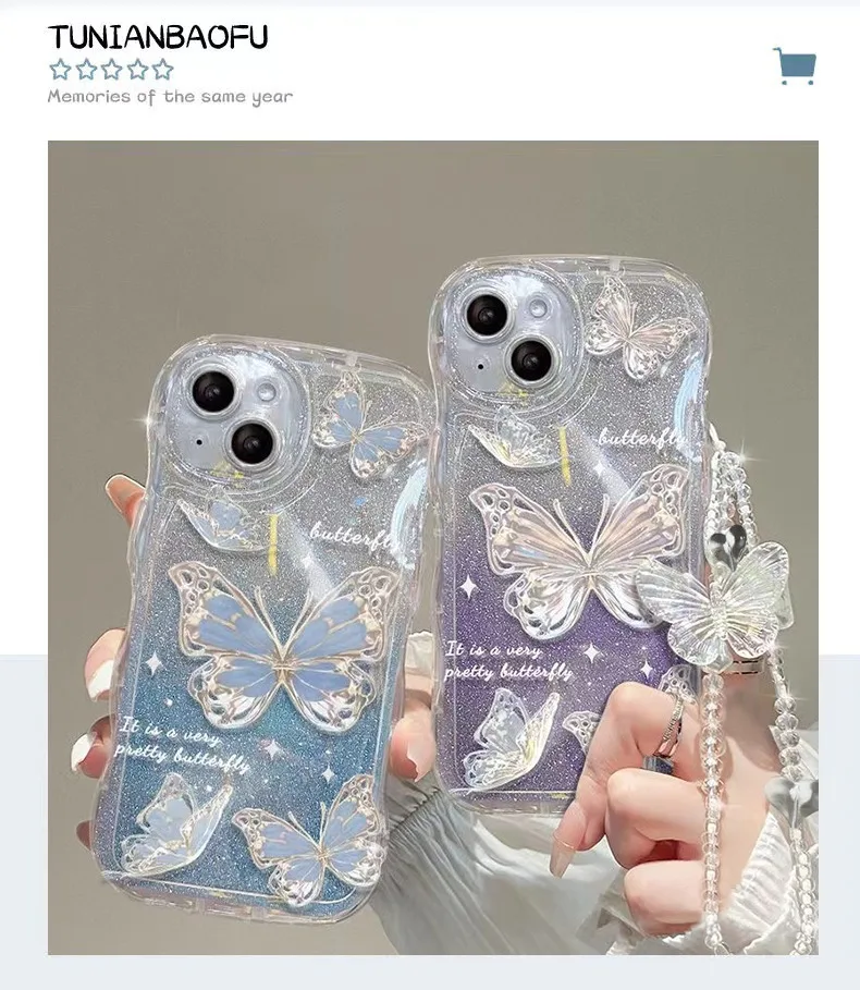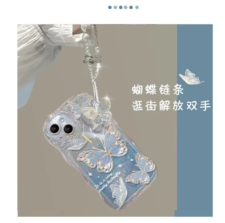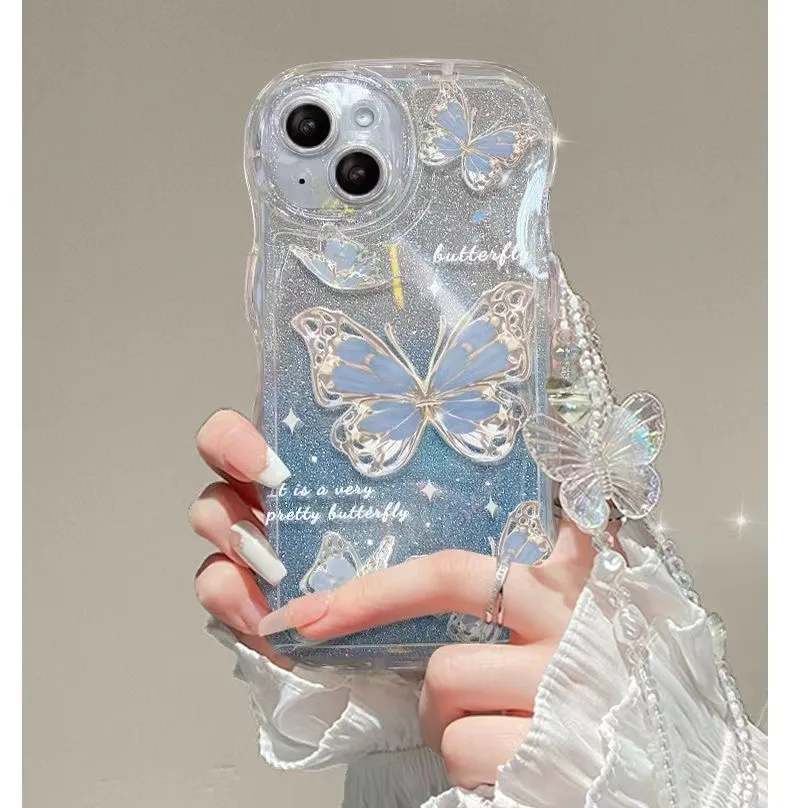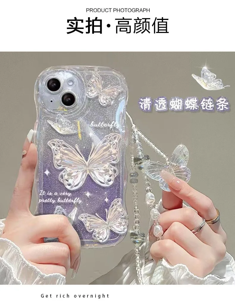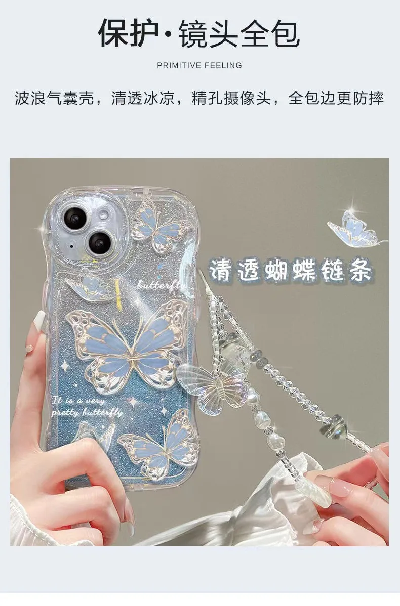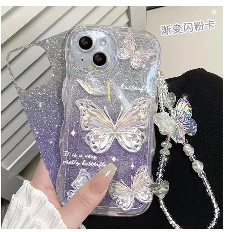 Luxury New Gradient Glitter Bling Butterfly With Bracelet Chain Wave Phone Case For Iphone 14 13 12 11 Pro Max Protection Cover |