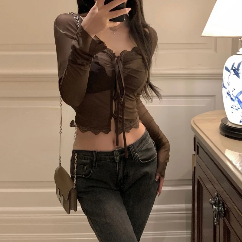 Sexy Tops Blouses for Women V-neck Long Sleeve Tunic Shirts Guaze See Throught Lace Bandage Summer Blouse 2025 Blusas De Mujer