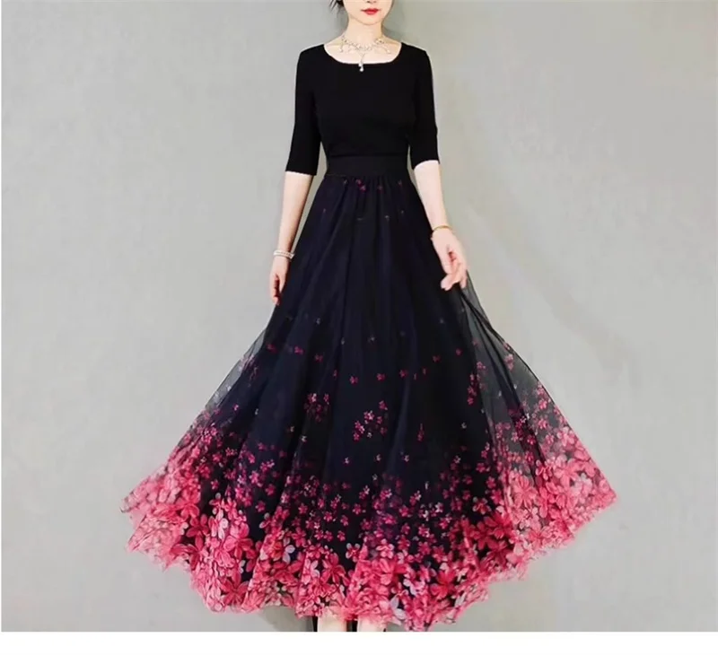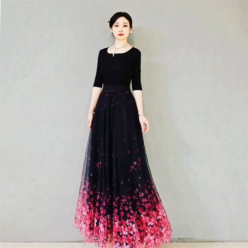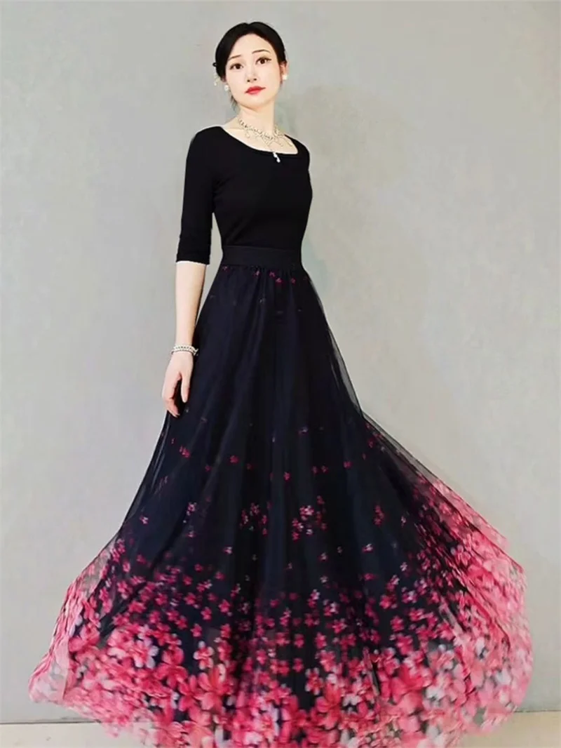 Skirt Women's Long Skirt 2024 New High Waist Slim A-line large Swing Skirt Female A-Line Skirts Summer Sakura Gradient Long Skir