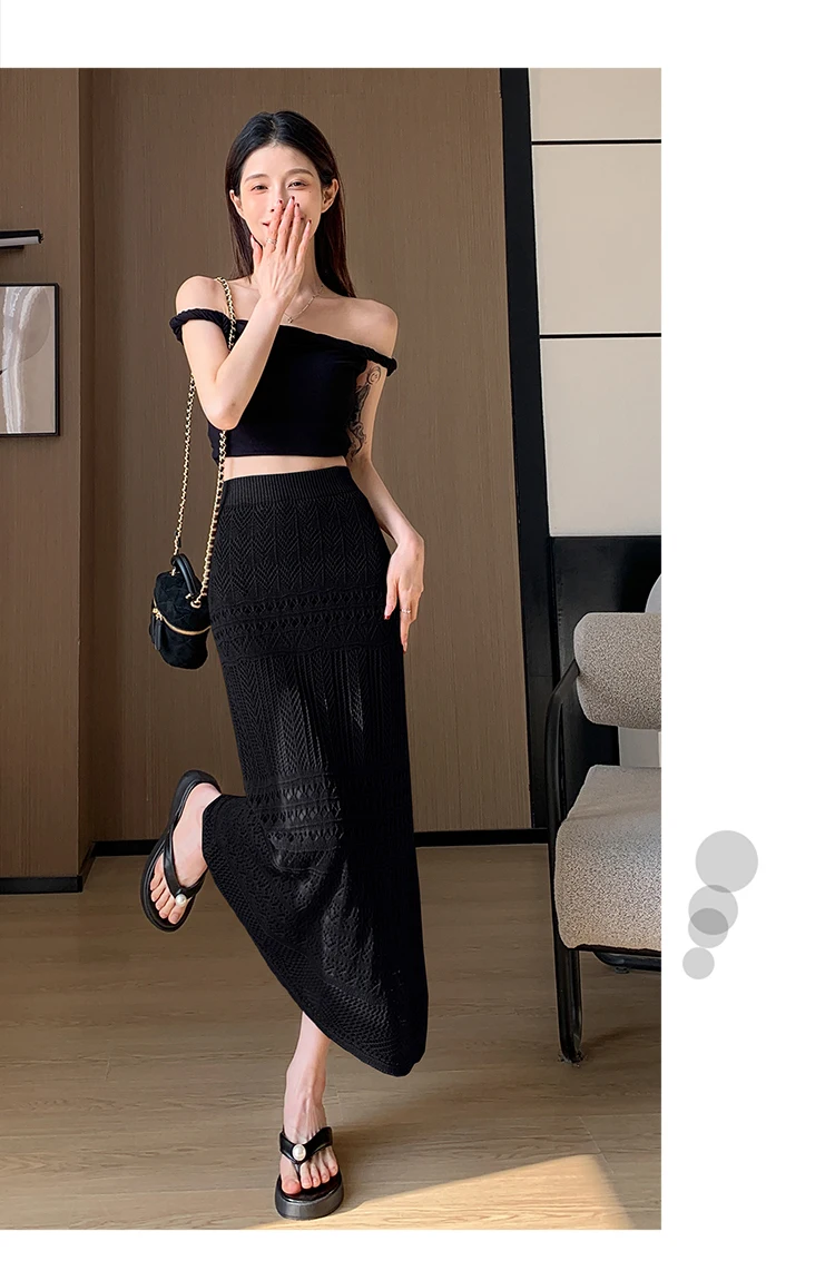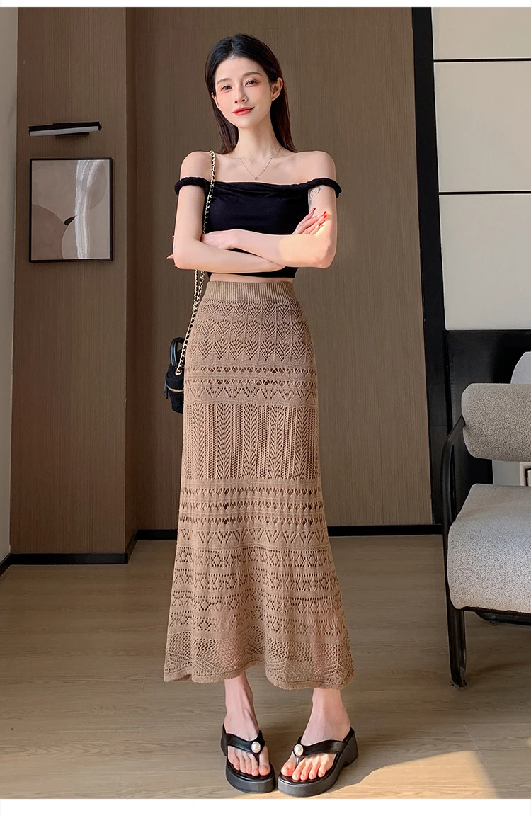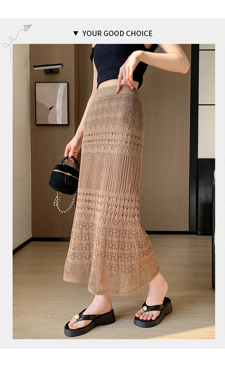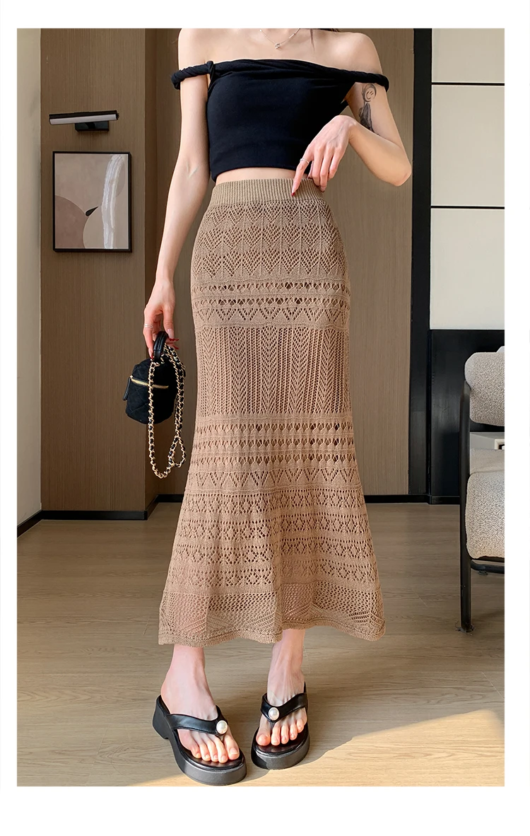 Skirts Women Trumpet High Waist Long Skirt Female Summer Elegant Knitted Hollow Out Fahison Skirt Bottom