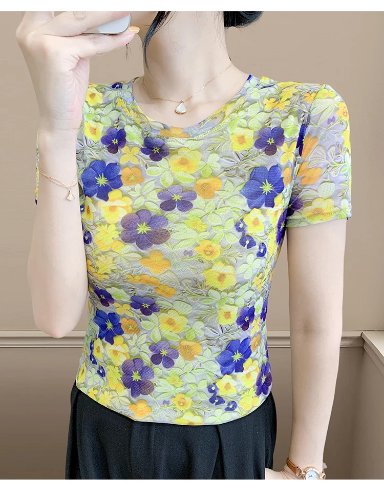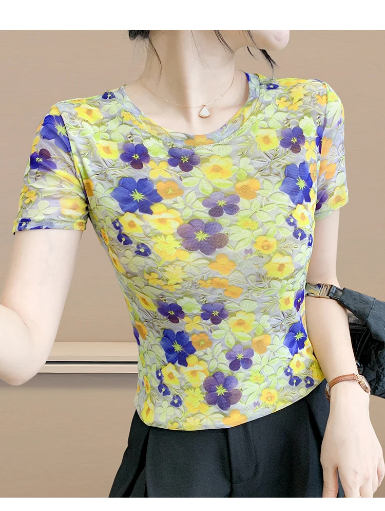 Summer Tops for Women: Breathable Mesh-Lined Slim Fit Tee with Trendy Prints Youthful Mother's Casual Short Sleeve T Shirts