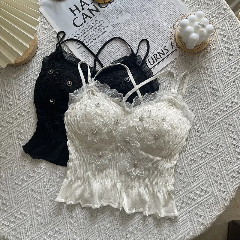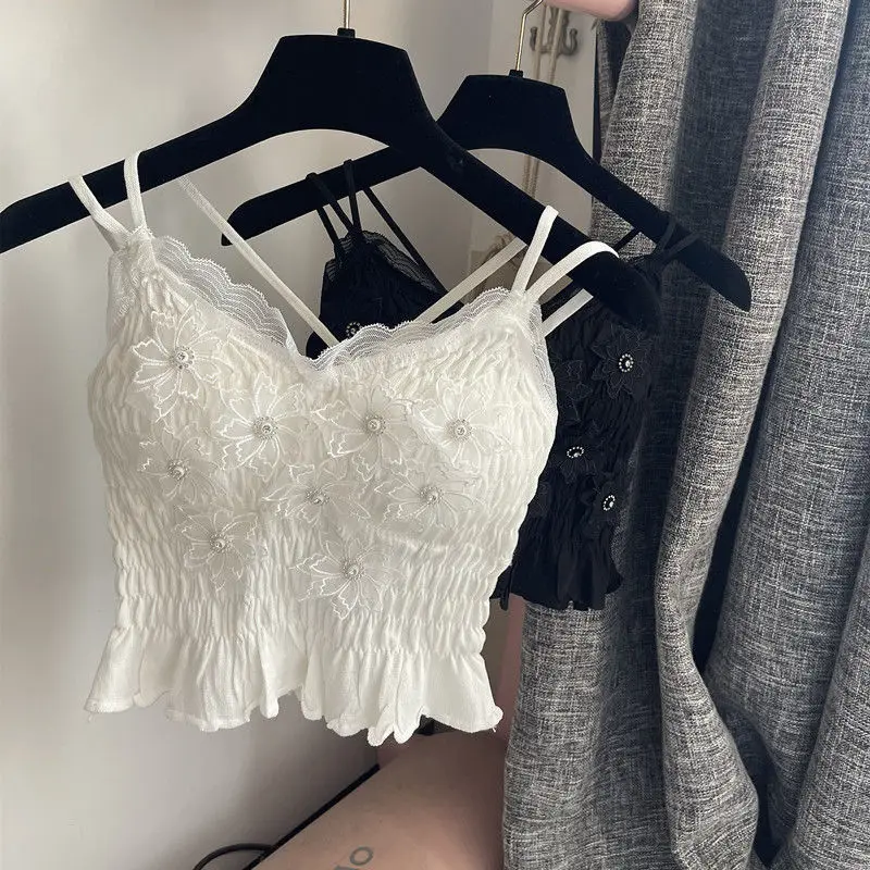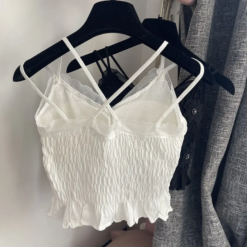 Summer Woman Clothes y2k Tops French Diamond Appliqué Camisole Bottoming Shirt Lace Crop Top Women's Folds Spaghetti Strap Tops