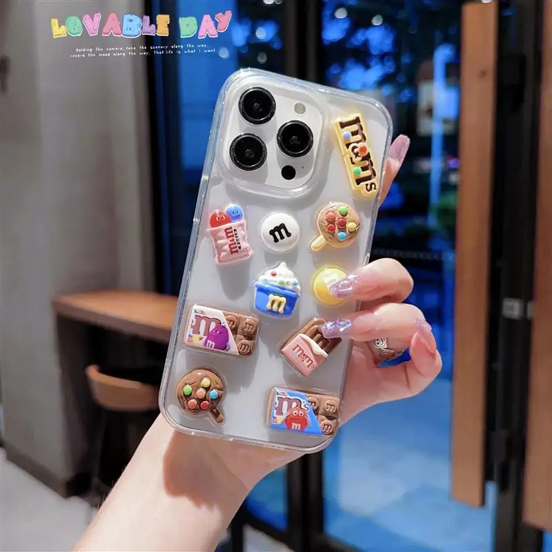 Super Cute M beans chocolate Phone Case for iPhone 16 15 14 13 12 11 Pro Max Cases Silicone Cover Transparent 3D Cartoon Funda