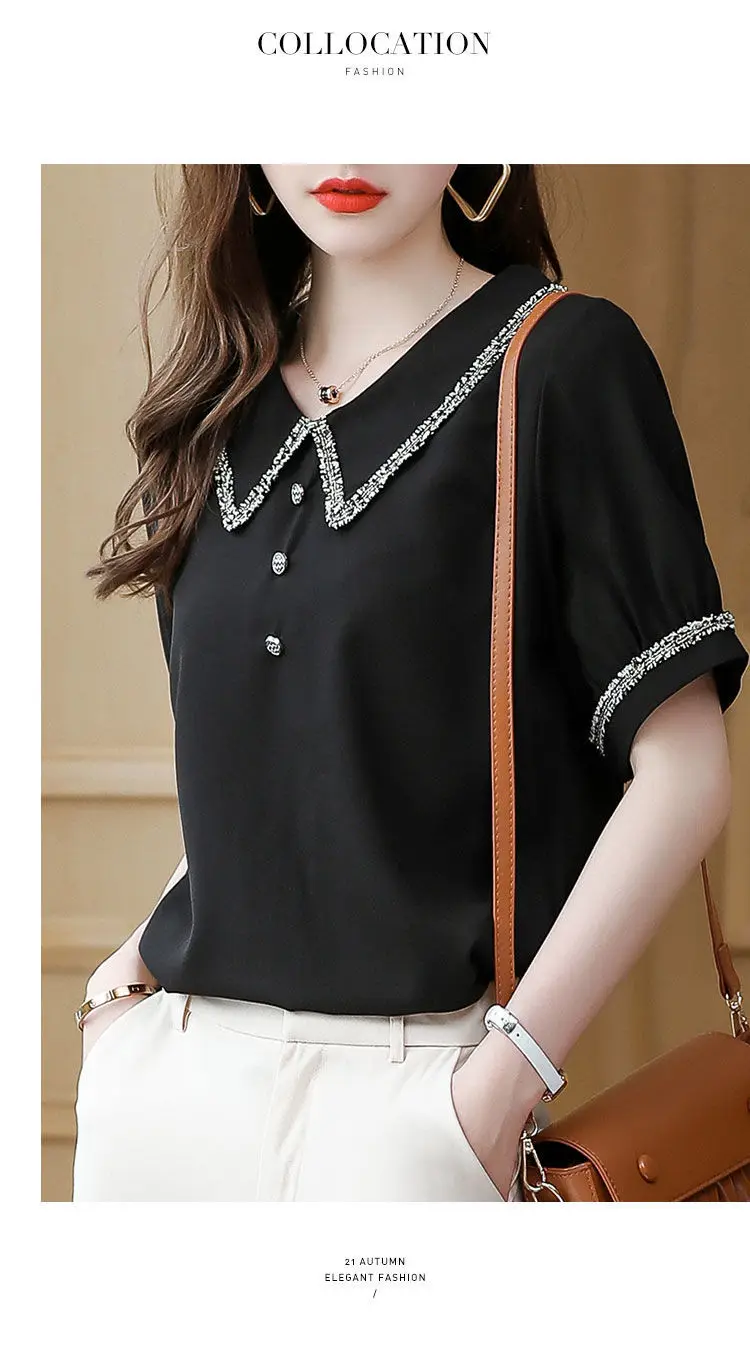 Top for Woman Office Outfits Clothing Black Women's Shirts and Blouses Chiffon Wear To Work Formal Collar Short Sleeve New 2024