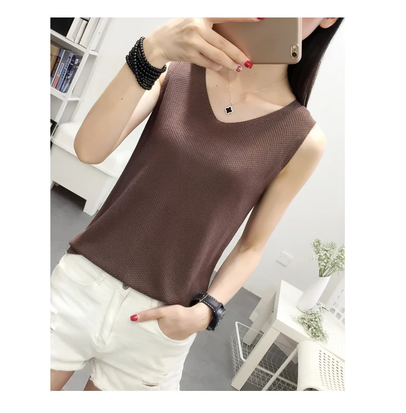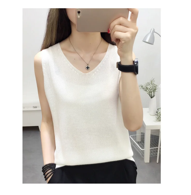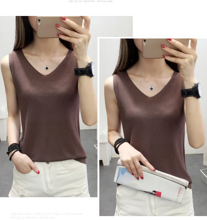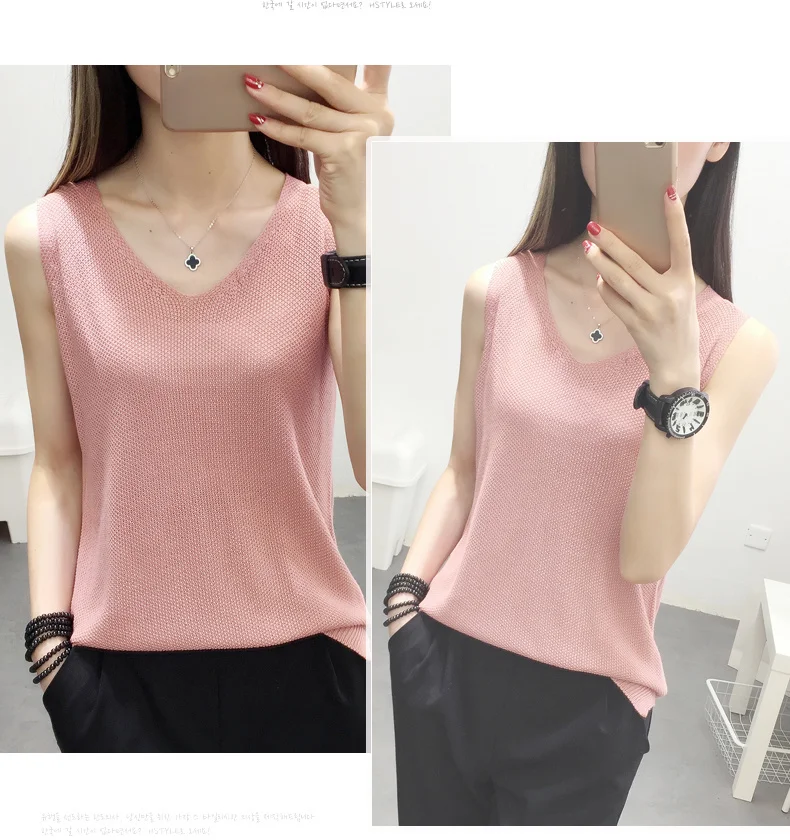 Top women Summer V Neck Hollow Knitted Vest Sleeveless Casual Tank Blusas Tops Sheer Mesh Patchwork T Shirt Bottom Camisole 2019