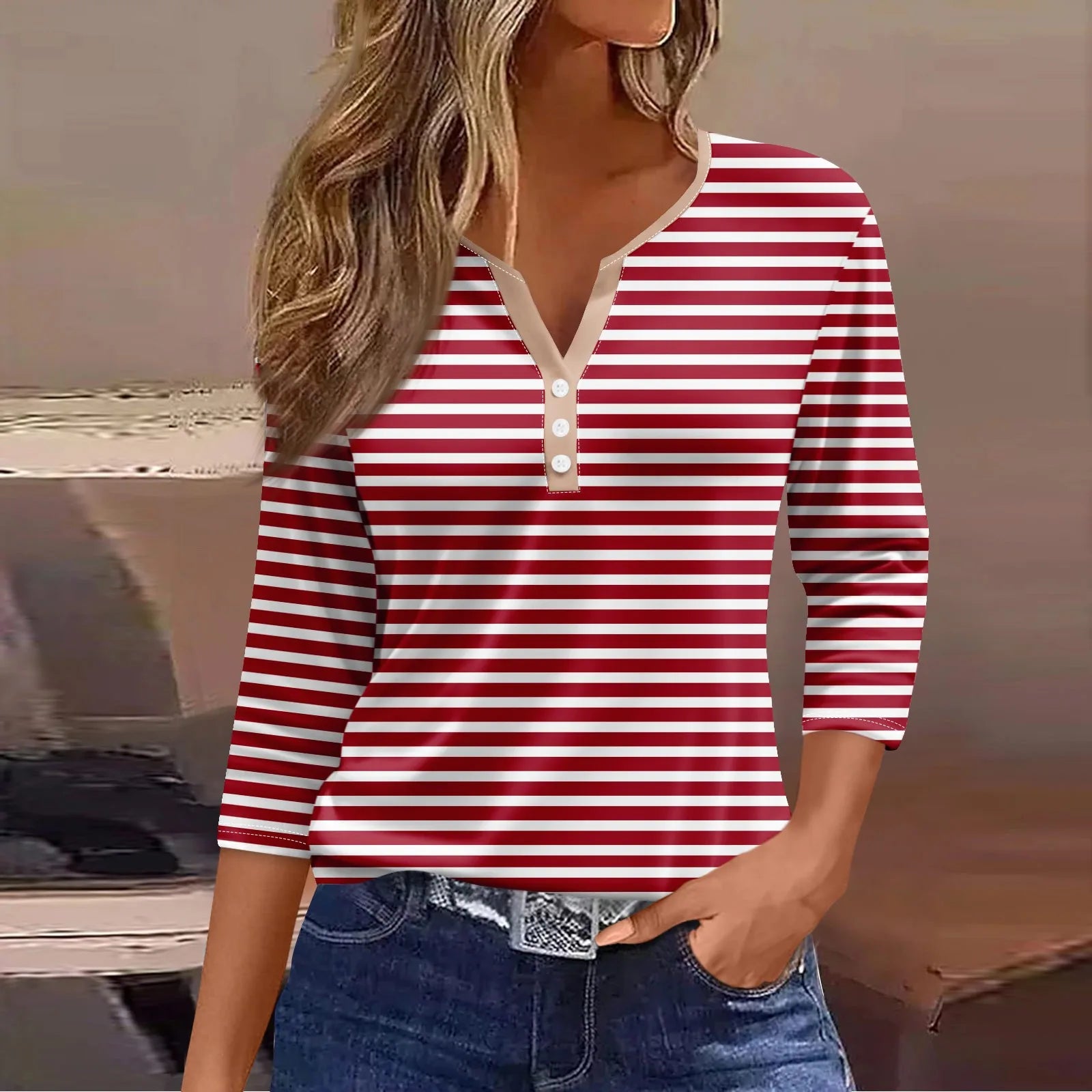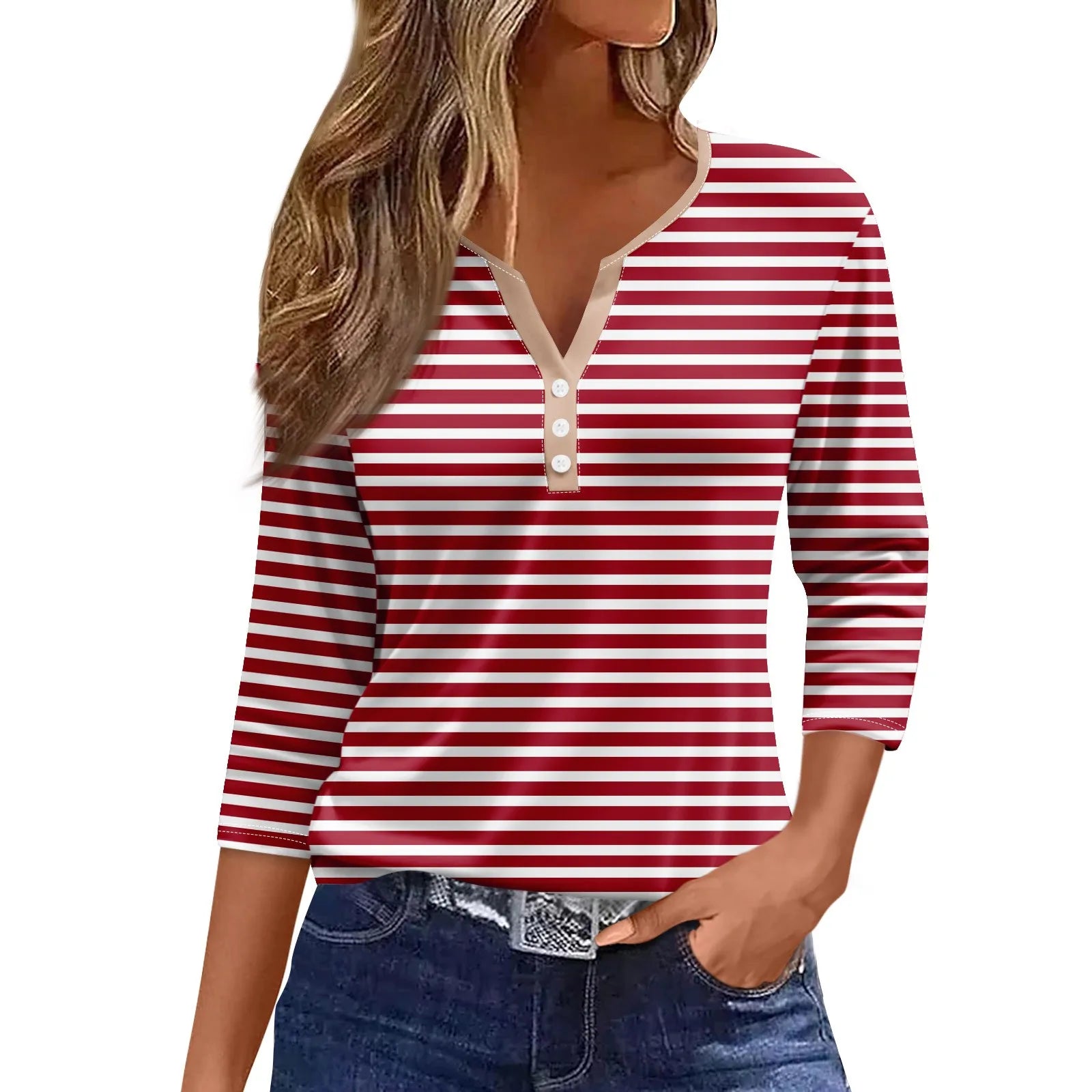 Tops For Women Women'S T Shirt Tee Print Button 3/4 Sleeve Daily Weekend Fashion Basic V Neck Regular Top Ropa De Mujer New