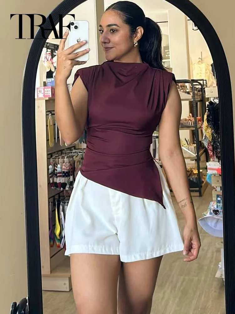 TRAF Ruffled Asymmetric Tops For Women Tanks & Camis Summer 2025 Burgundy Brown Black Tank Tops Ruched O-Neck Sleeveless Vests