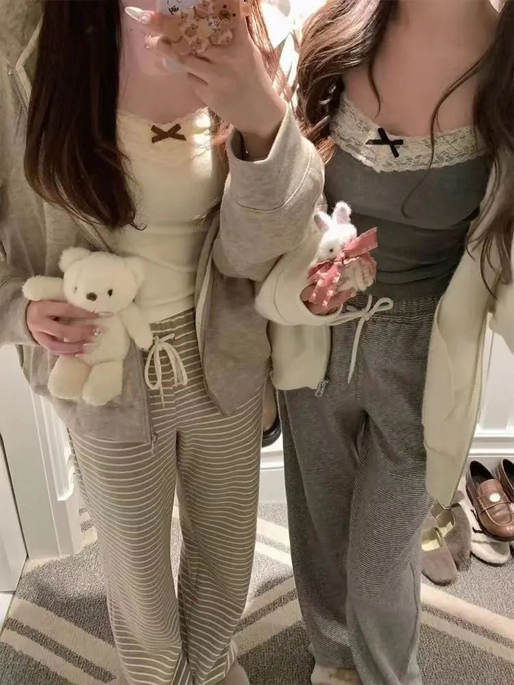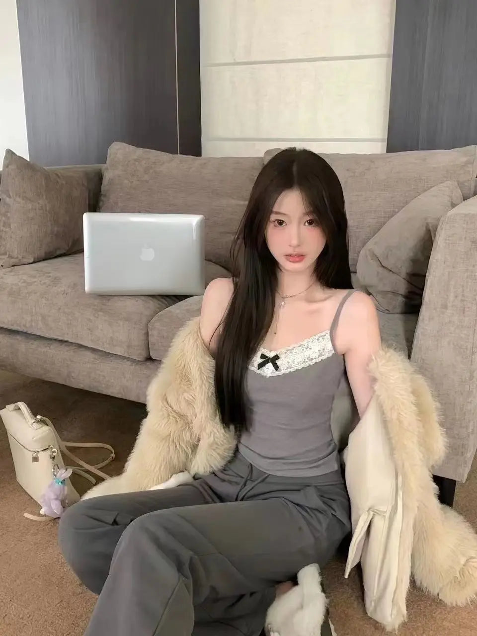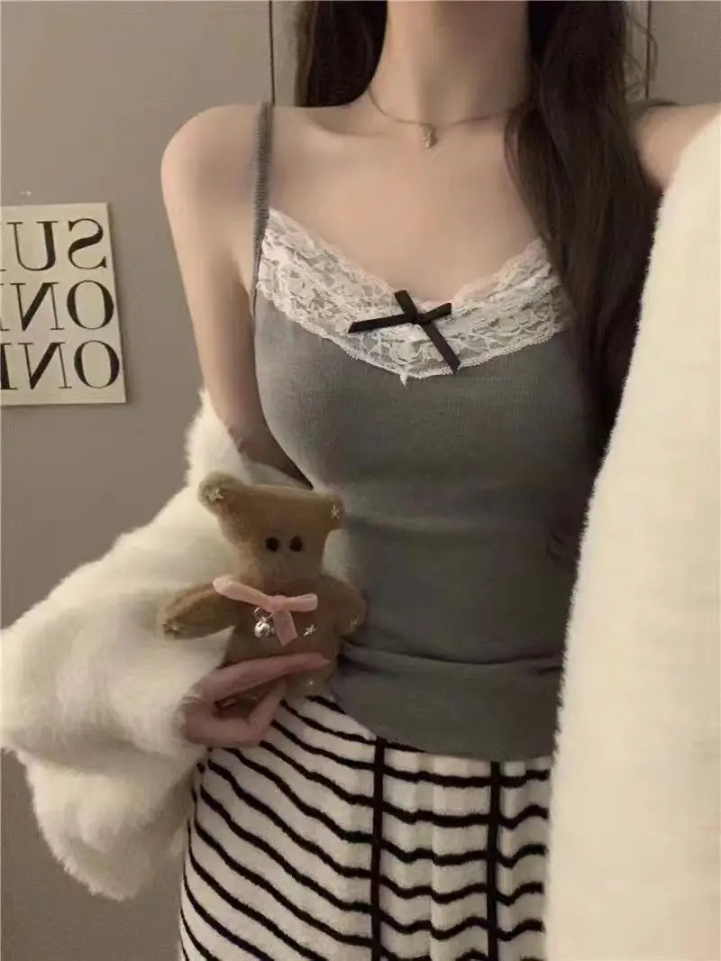 Women Camisole Tank Tops Sexy Bow Sleeveless Corset Top with Chest Pad Sweet Lace Patchwork Crop Tops Summer Slim Elegant Camis